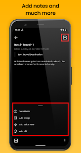 Well, to begin with, NOTED gives you a clean interface to add note with title, subtitle and note's body. Then again, you can add color to your note. You can then add image to your note. NOTED provides you with two ways to add image - Take photo via device's camera and choose image from gallery. After choosing a picture, you can edit it - crop, scale or rotate. You can also add web links (URLs) to your note. You can add voice note also in case you hate typing ;)