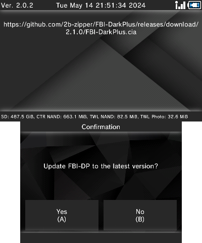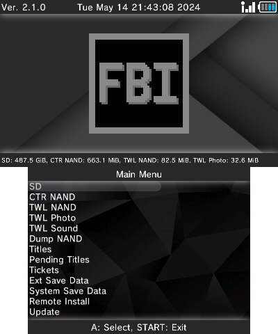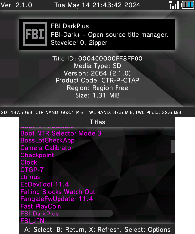 FBI-DarkPlus is an open source title manager for the 3DS. FBI was originally authored by Steveice10.