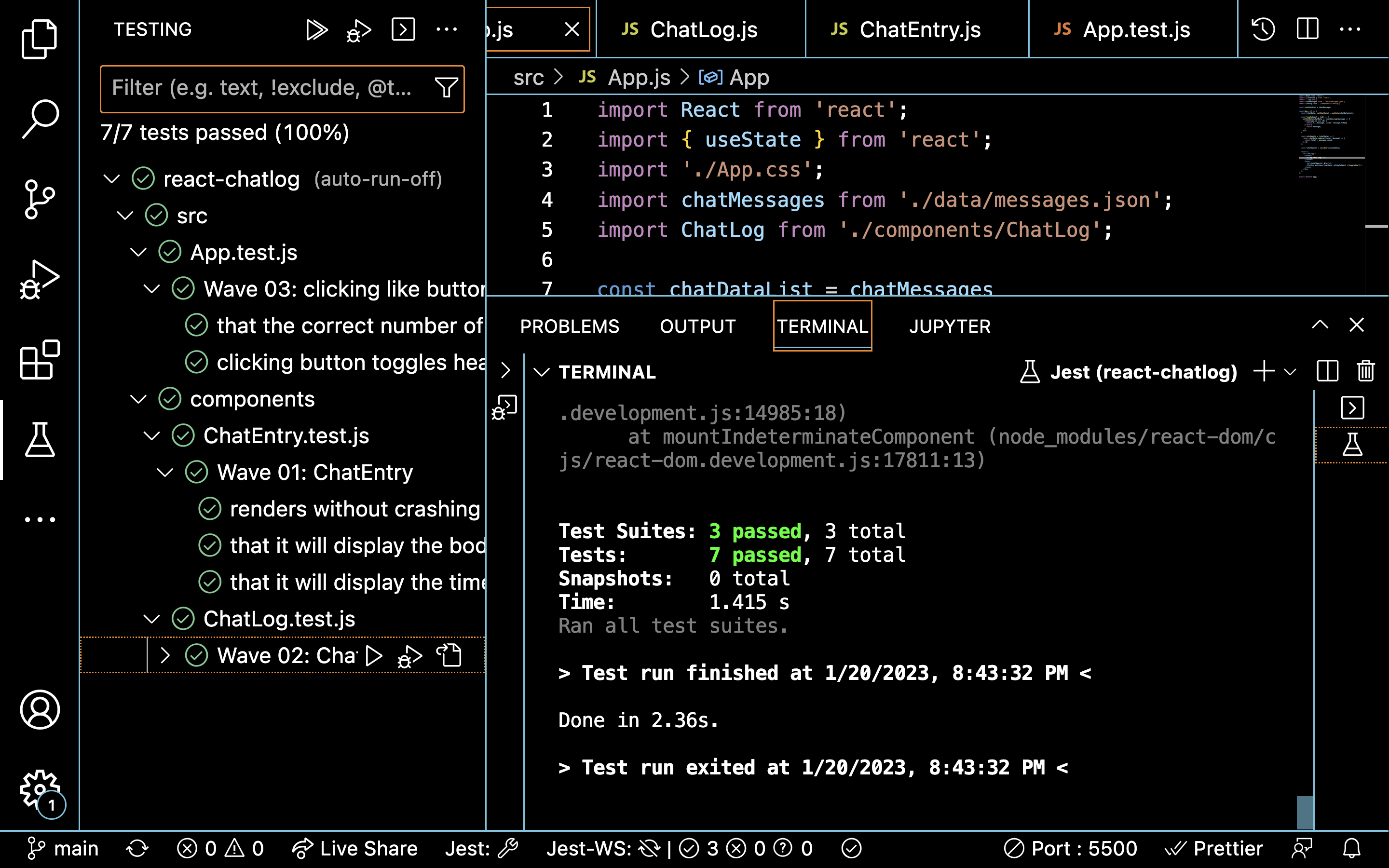 I was able to get all the test to pass on my end and yarn start. when I look at the file names on git it says Chatlog.js but in VS code it says ChatLog.js. I am not sure why it's not pushing over to github.