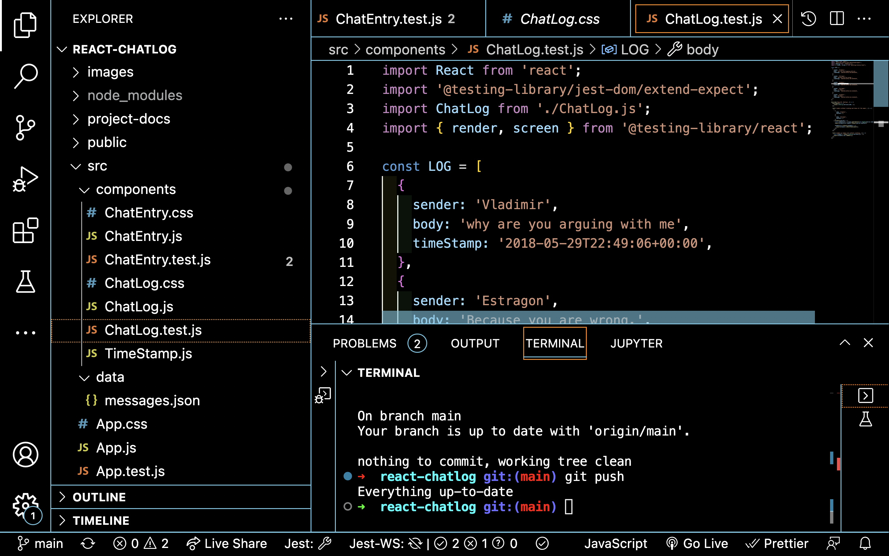 This file name is ChatLog.js here, but the name is actually Chatlog.js which prevents the code from compiling. Did you run into any errors when trying to push up the ChatLog.js to your github repo?