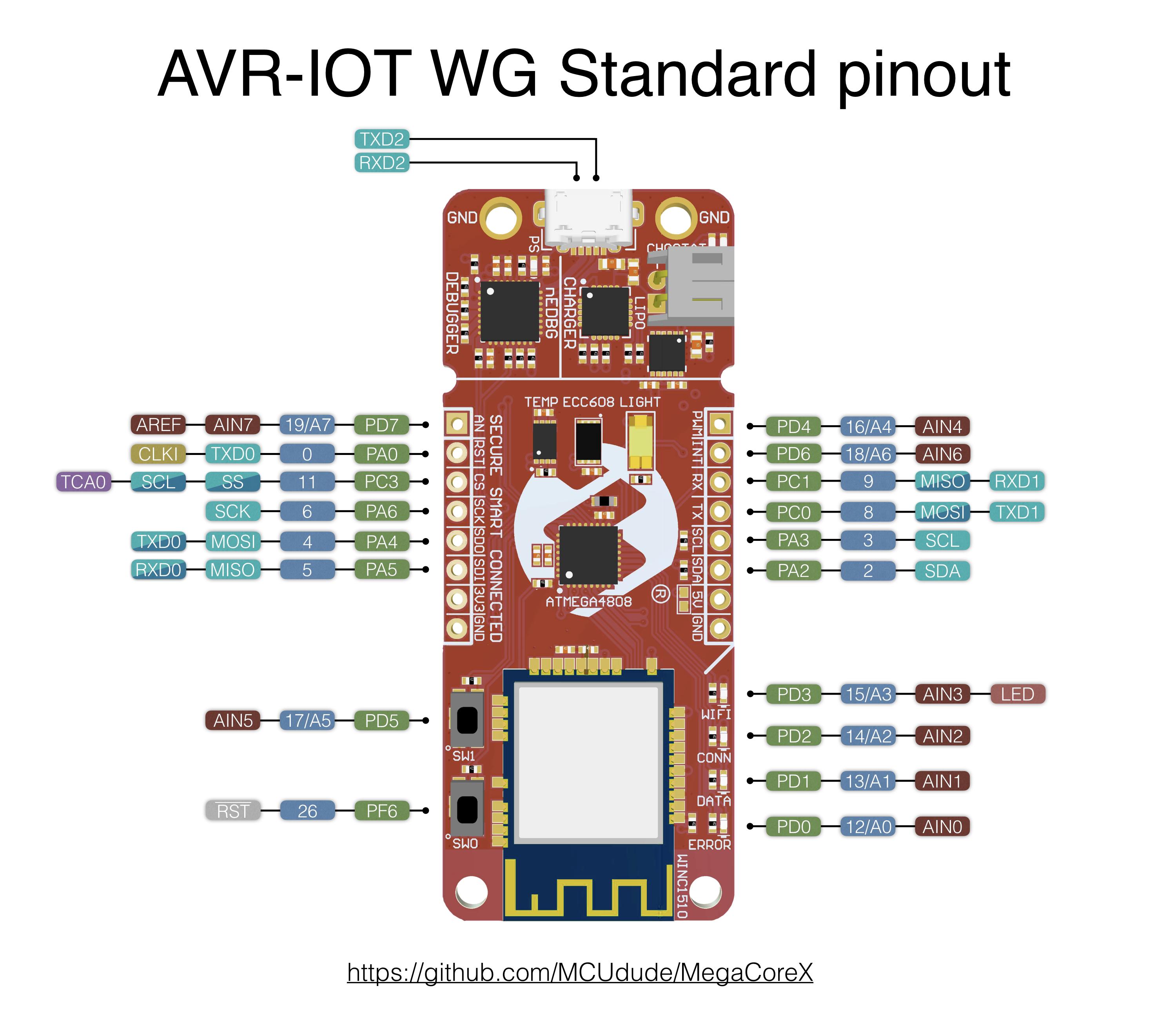 The AVR-IOT WG uses the ATmega4808 in a 32 pin package. 32 pin standard is the correct pinout for this board. Use the LED_BUILTIN macro to control the onboard LED marked with WIFI. Note that UART2 is connected to the nEDBG chip (often refered to as the debug serial port). This means tou'll have to use Serial2.begin(baud) in order to print to the serial monitor. You'll also have to choose Atmel nEDBG (ATSAMD21E18) as your programmer in order to upload code. For more information about this board please refer to the userguide and its schematic.