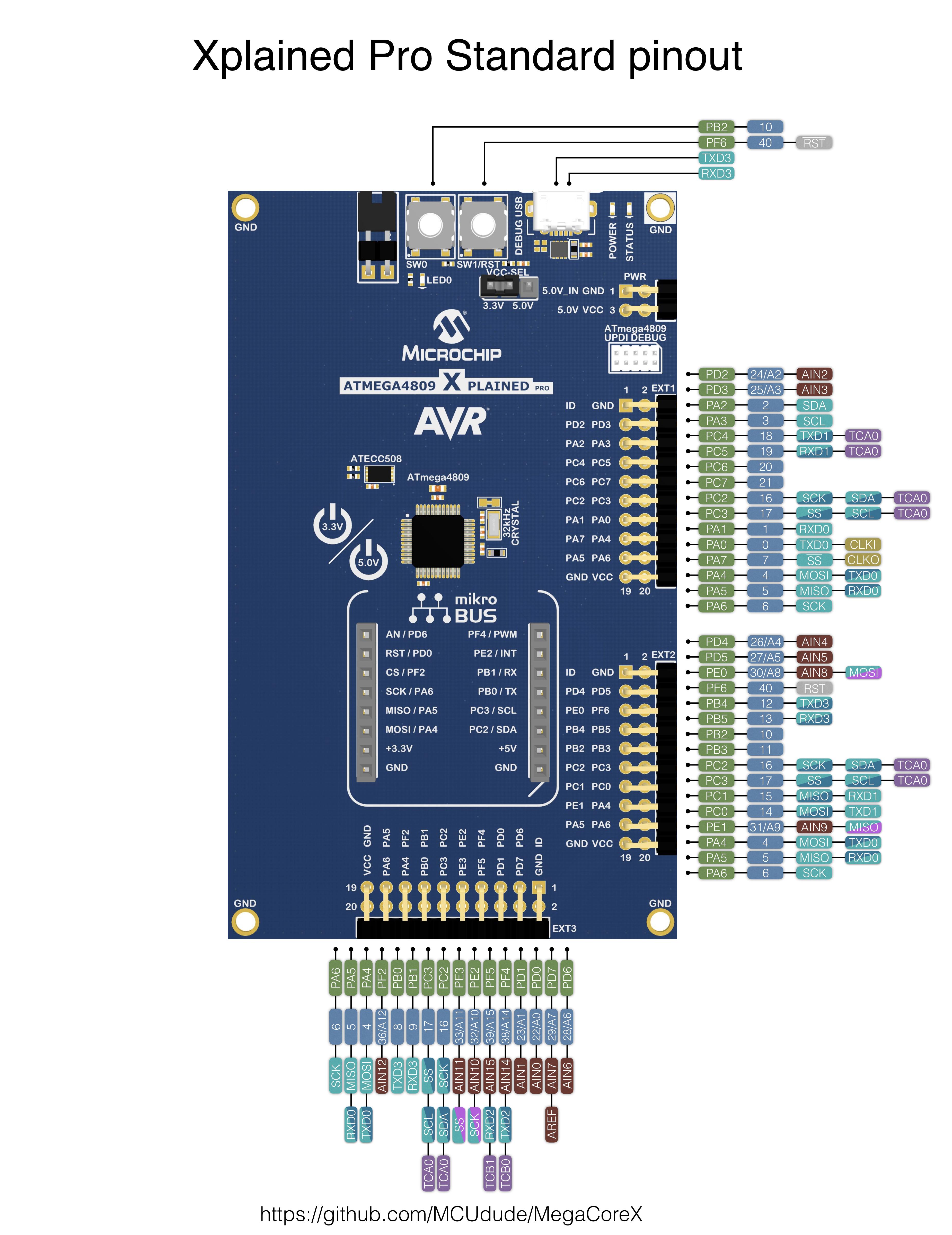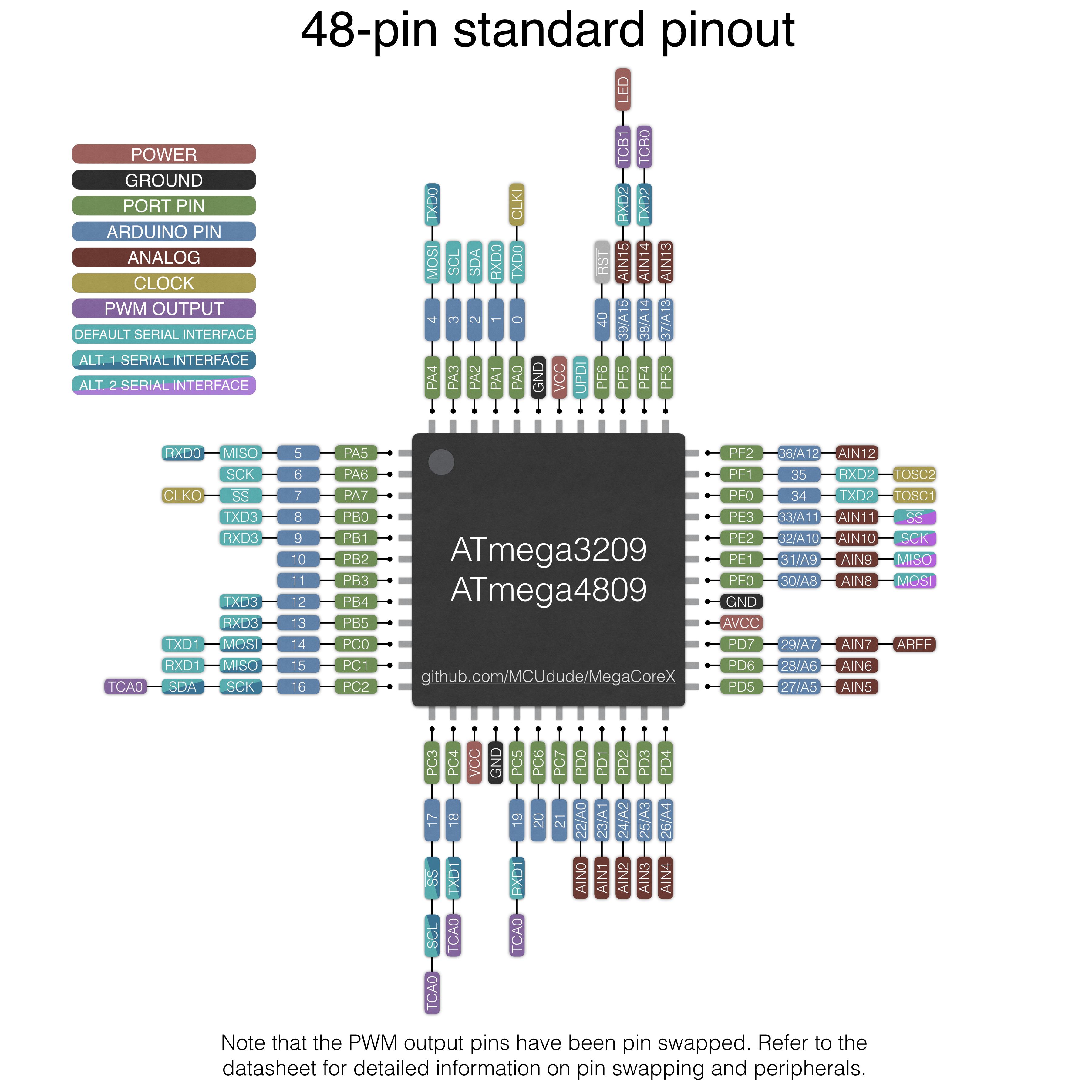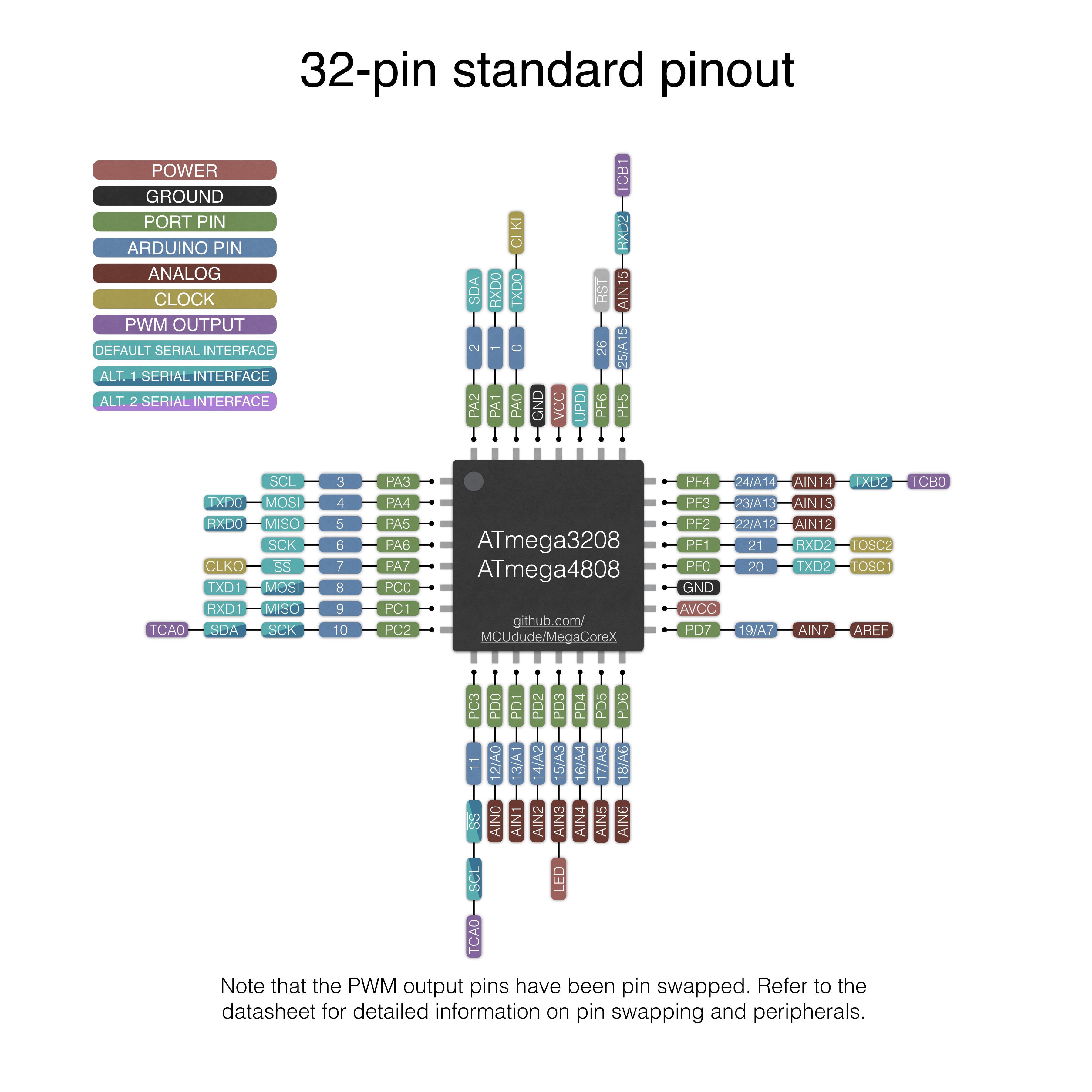 - 32 pin standard: This is the pinout for the 32 pin version of the ATmega3208/4808. Again, it will not be compatible with shields or anything like that, but it's clean and elegant from a hardware point of view. The only pin swap done by default is the PWM output pins. This is done to prevent them from "colliding" with other peripherals.