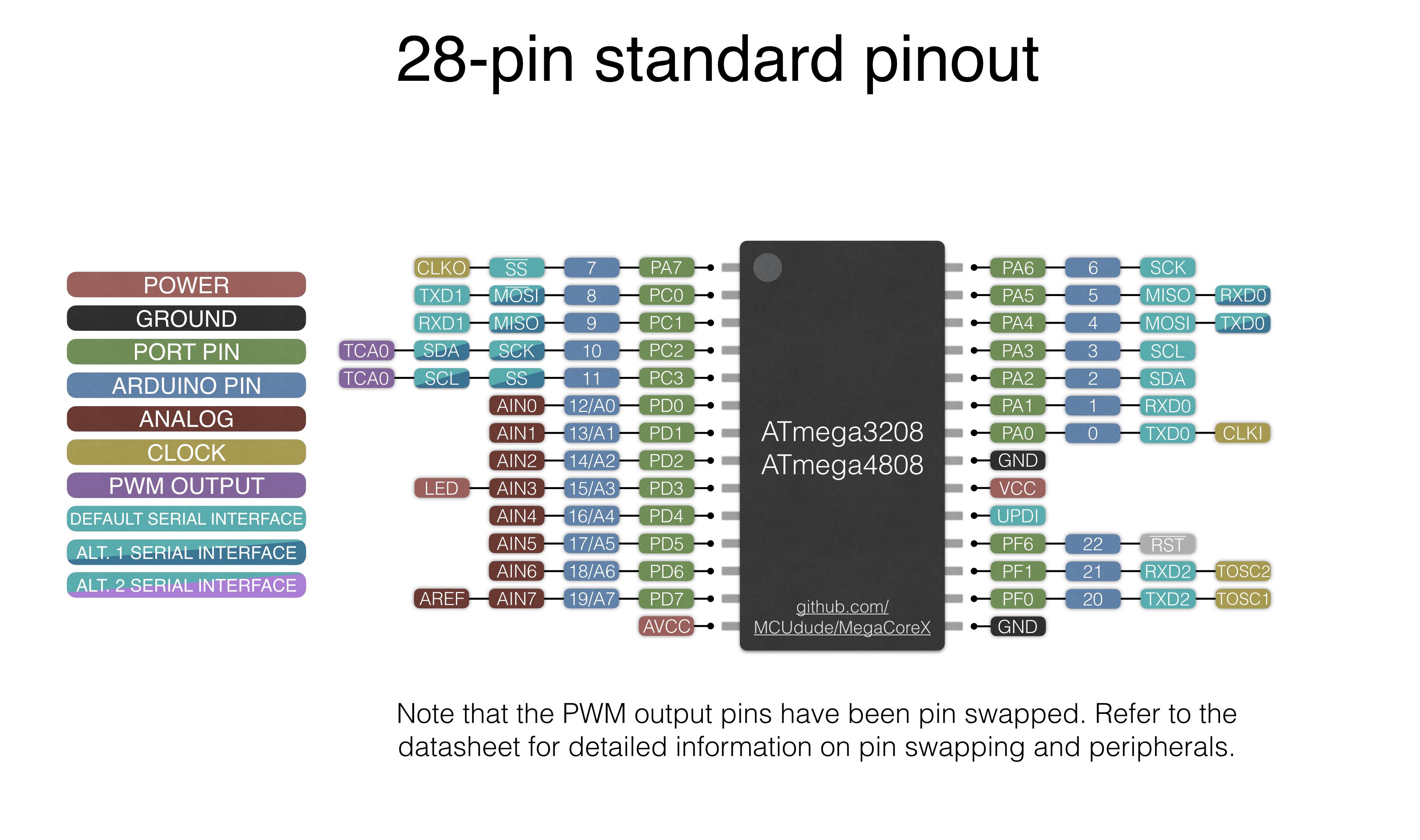 - 28 pin standard: This is the pinout for the 28 pin version of the ATmega3208/4808. Will not be compatible with shields or anything like that, but it's still clean and elegant from a hardware point of view. Only pin swap done by default is the PWM output pins. This is done to prevent them from "colliding" with other peripherals.