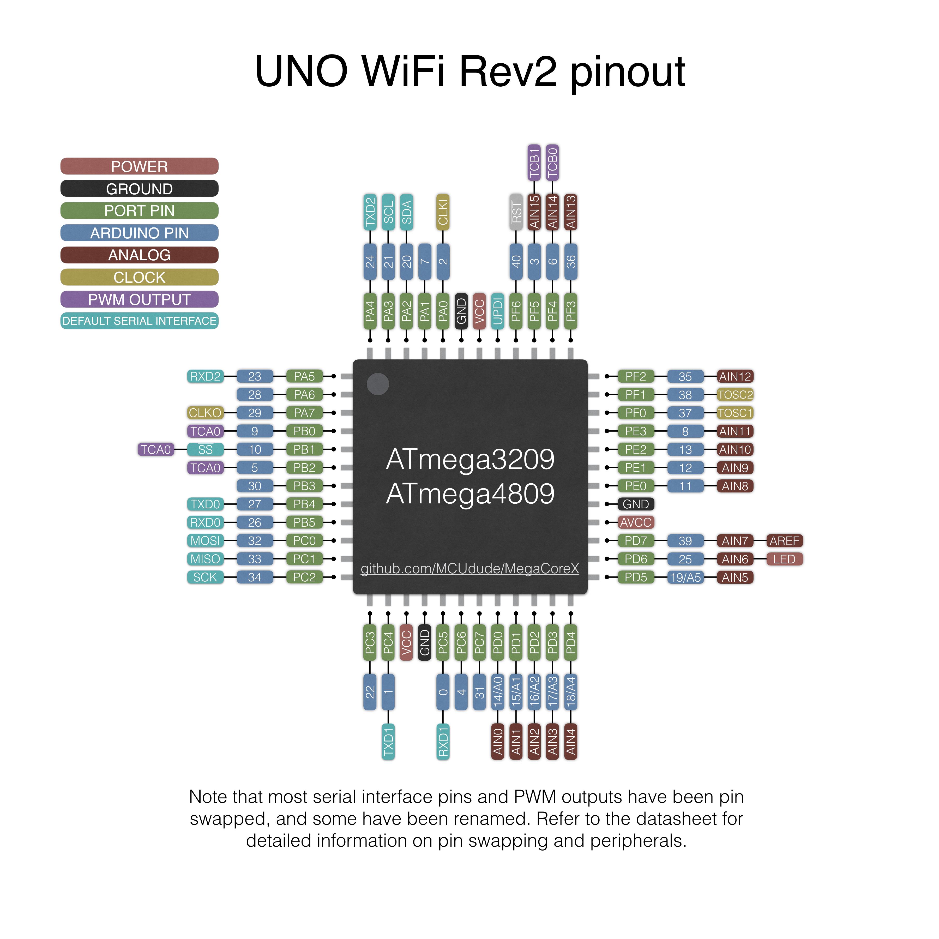 - Uno WiFi: This pinout is 100% compatible with the Arduino Uno WiFi Rev2 hardware. If you have code that's written for the Uno WiFi Rev2 it will work without any modifications if you choose this pinout. Note that this pinout does pin swapping on serial interfaces and PWM pins by default, and some peripherals are renamed to match the original 328P Uno hardware better. Note that this pinout is only available on ATmega3209/ATmega4809.