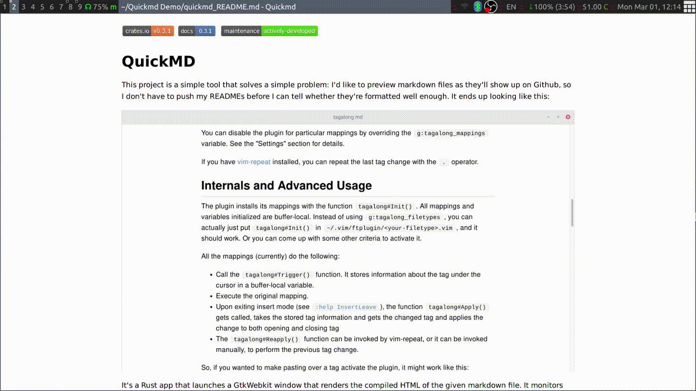 It's a Rust app that launches a GtkWebkit window that renders the compiled HTML of the given markdown file. It monitors this file for any changes and reloads. It uses a stylesheet that's literally copied off Github's markdown stylesheet.