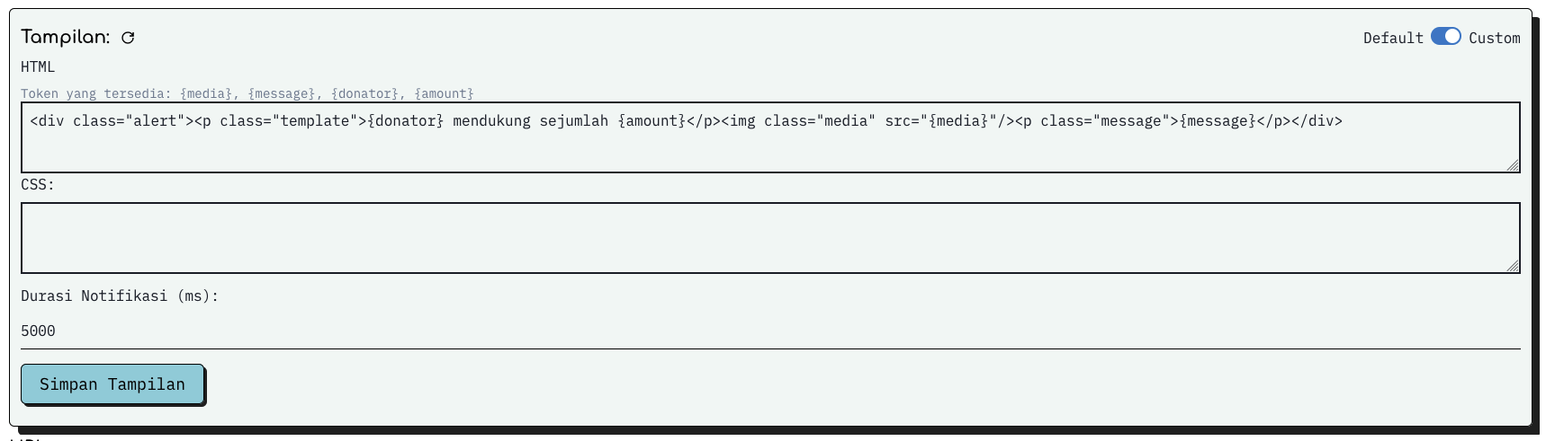 Buka halaman pengaturan overlay saweria pada tabs "Alert" Cari dan klik custom pada ujung kanan atas dialog Tampilan seperti gambar diatas