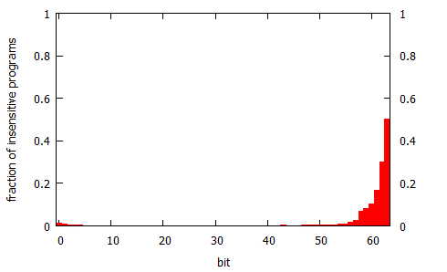 This shows that SuperscalaHash has quite low sensitivity to high-order bits and somewhat decreased sensitivity to the lowest-order bits. Sensitivity is highest for bits 3-53 (inclusive).