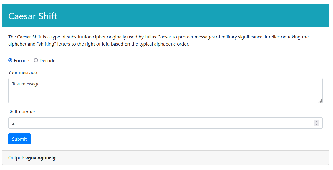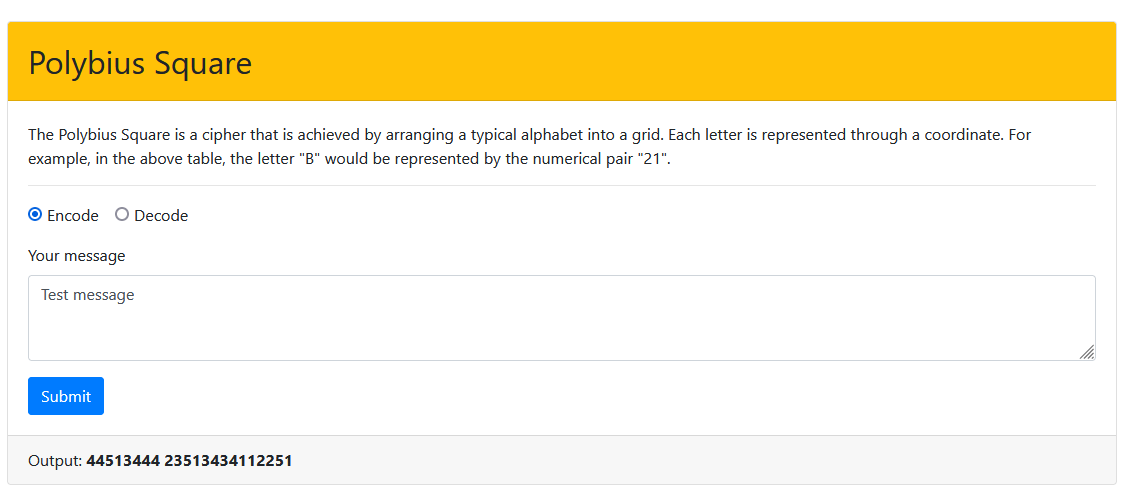 This application uses a provided front end to display various functions I wrote to learn and apply data manipulation. It allows for encoding and decoding text using a Caesar Shift, a Polybius Square, and a Substitution Cipher.