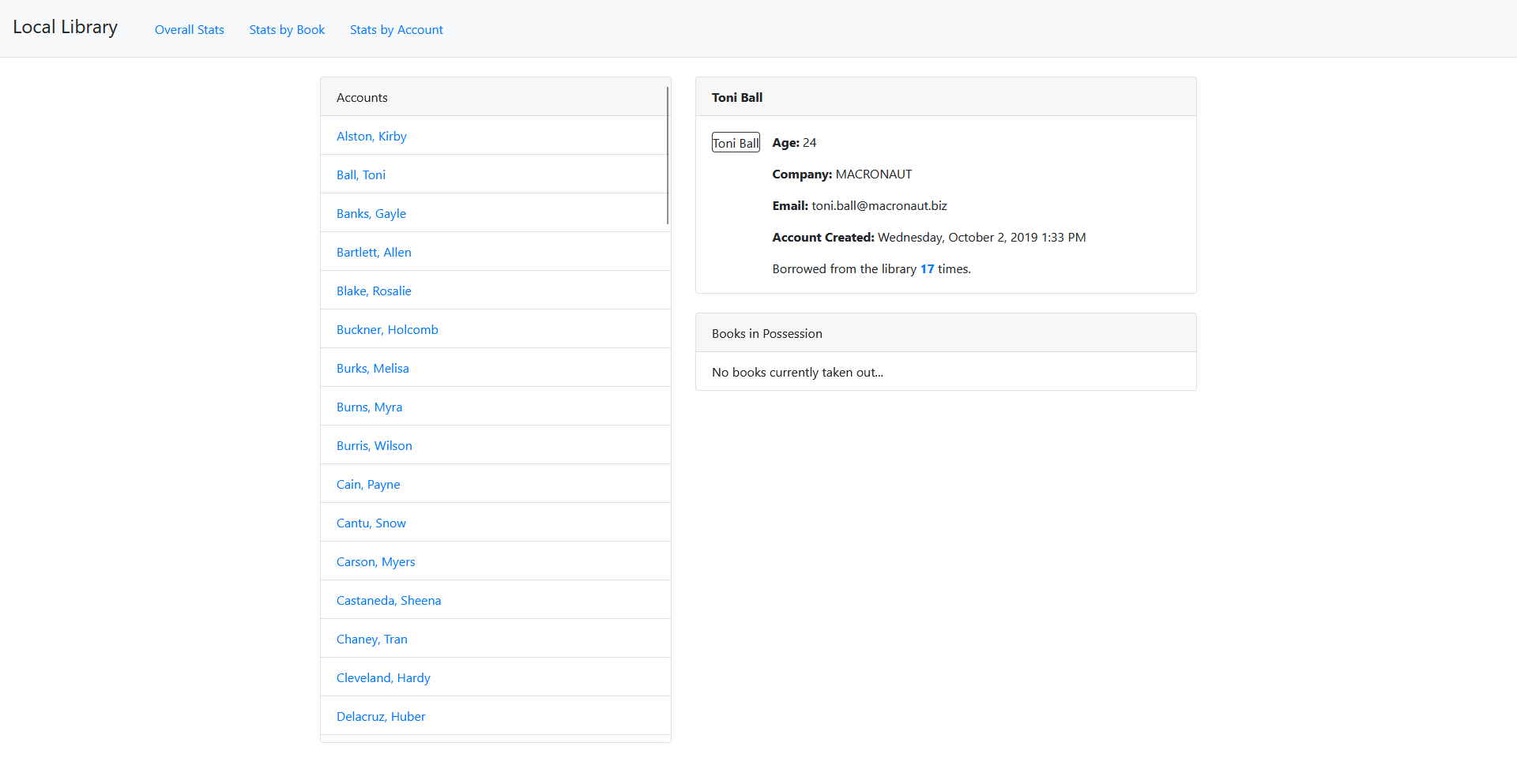 The Stats by Account page shows a list of all accounts, and when one is selected, displays information about each borrower and what books are currently in their possession.