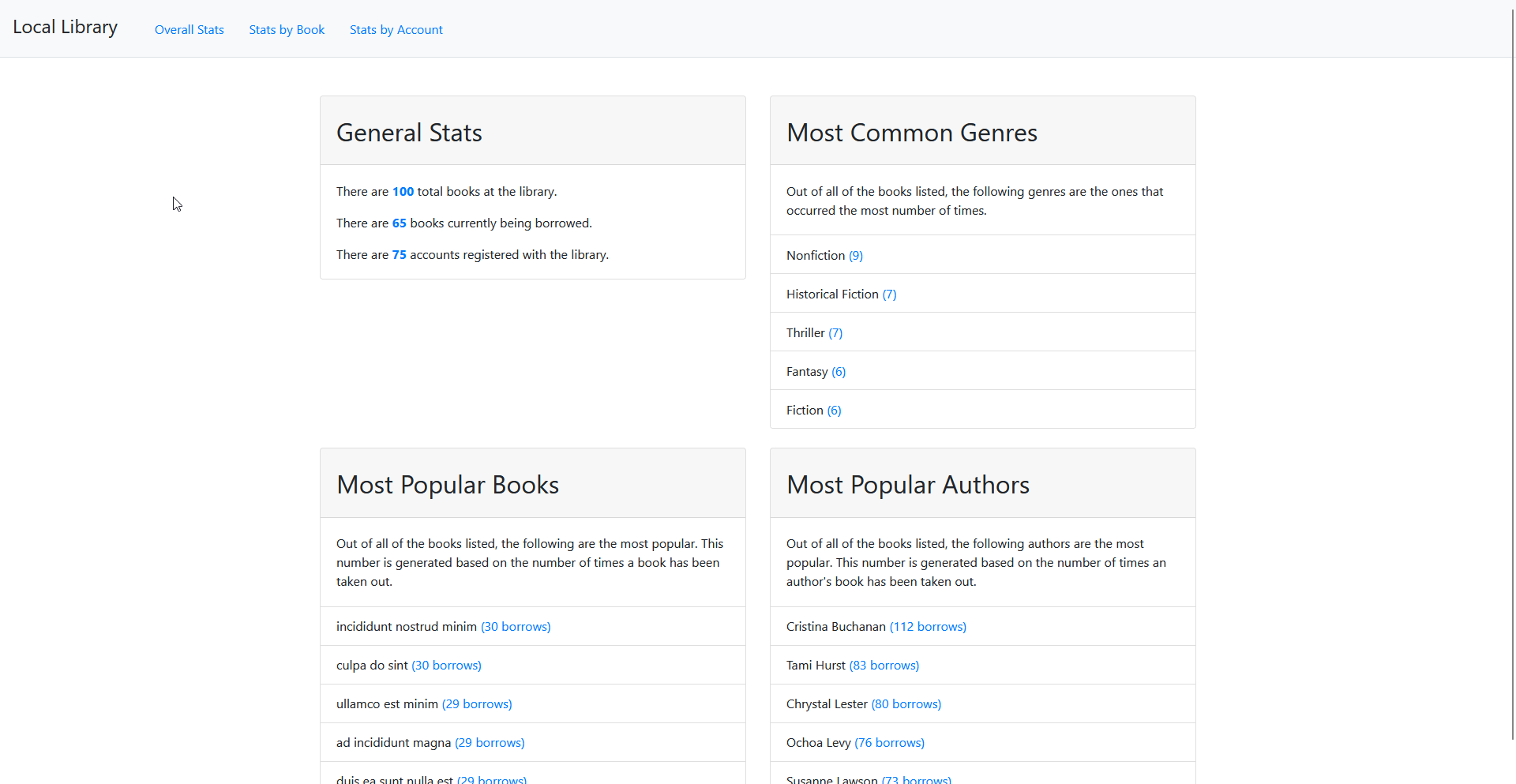 The dashboard pulls information about all the books in the libary, their authors, and various information about popular books.