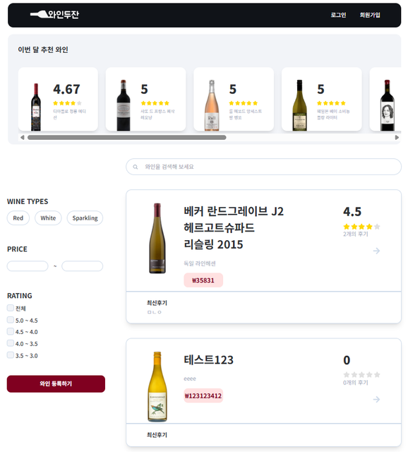 - 와인 리뷰 작성 및 조회: 사용자는 와인의 종류, 맛, 가격대, 별점 등을 포함한 상세한 리뷰를 작성하고 다른 사용자의 리뷰를 확인할 수 있습니다.