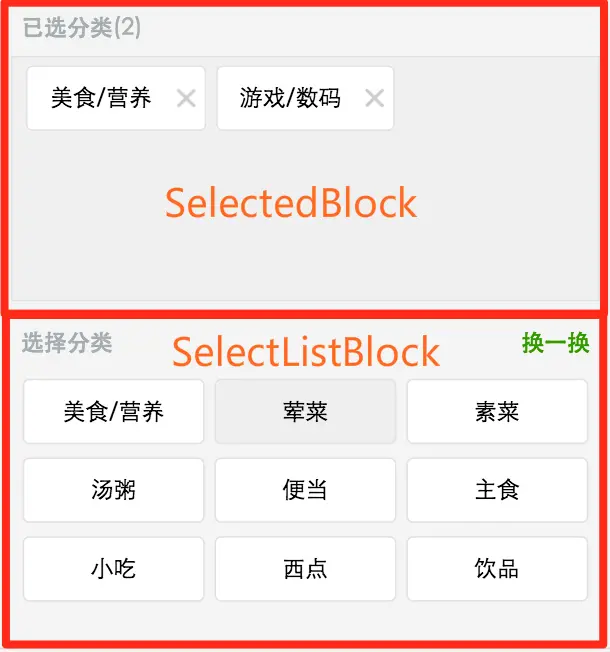 有了以上划分,我们有了: 1)SelectedBlock组件需要关心已选数据likedList; 2)SelectListBlock则选择池数据和已选数据都需要关心。 你可能会问『SelectListBlock关心选择池数据不就够了吗?』 但是,产品经理要求在选择池里,当渲染用户已选条目时,需要样式置灰,并且在点击已选分类条目时不在触发action。所以选择池SelectListBlock组件也要依赖已选数据,进而做出相应的变化。