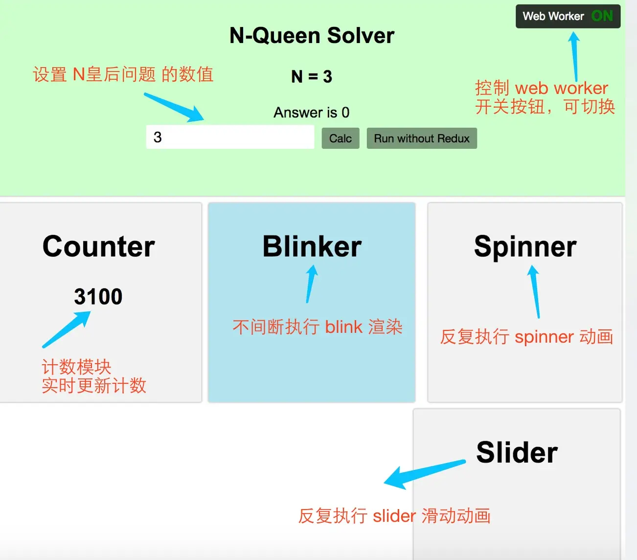 我使用 “N-皇后问题” 模拟大型计算,并且实现的 demo 中可以任意设置 n 值,增加计算耗时。 如果你不理解此算法也没有关系,只需要知道N-皇后问题这个算法的计算耗时很长,且和 n 值相关:n 越大,计算成本越大。