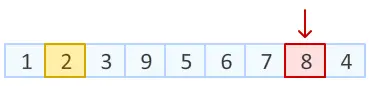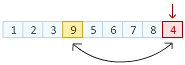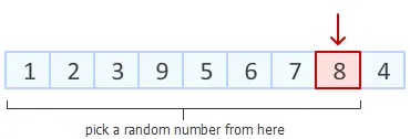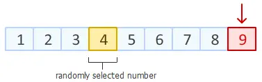 Step2: 上一步中,我们已经把数组末尾元素进行随机置换。 接下来,对数组倒数第二个元素动手。在除去已经排好的最后一个元素位置以外的8个位置中,随机产生一个位置,该位置元素与倒数第二个元素进行交换。