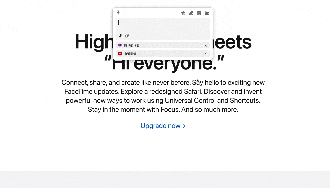 | 划词翻译 | 选中需要翻译的文本之后,按下划词翻译快捷键即可(默认 ⌥ + D) |