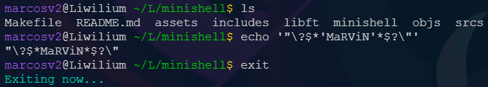 Ctrl-Cto interrupt andCtrl-\to quit a program, as well asCtrl-Dto throw an EOF, same as in bash. - A few of the built-in functions where made as well, meaning we don't call the executable, I re-coded them directly. It's the case for