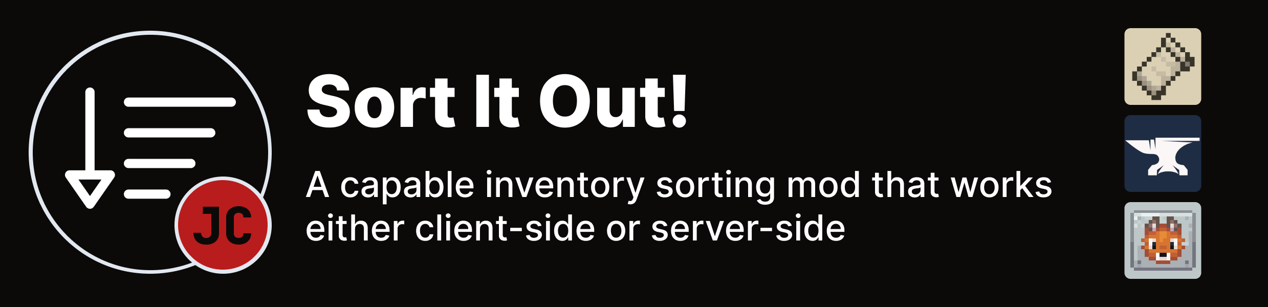 Sort It Out! can be configured via an in-game configuration screen which can be accessed in Mod Menu (Fabric/Quilt) or the mods screen (Forge/NeoForge). In the case that the mod is not installed on the clientside, players can use the /sortitout preferences command to view and update their preferences (which will persist across rejoins and server restarts).
