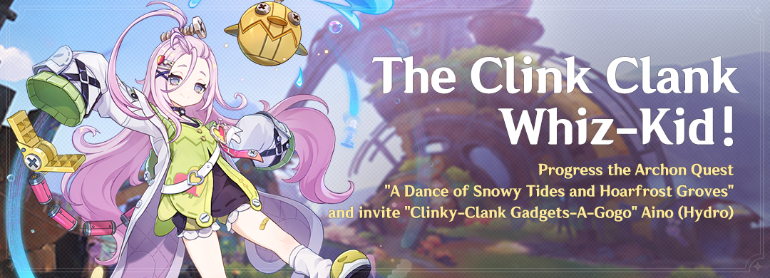 ※ Before you invite the character, the event page will be available throughout the "Song of the Welkin Moon" game version, and the event page will close once the "Song of the Welkin Moon" version ends. Then you will no longer be able to use the "Quick Start" function via the event page, but you can still invite "Clinky-Clank Gadgets-A-Gogo" Aino (Hydro) while progressing through the Archon Quest "A Dance of Snowy Tides and Hoarfrost Groves."