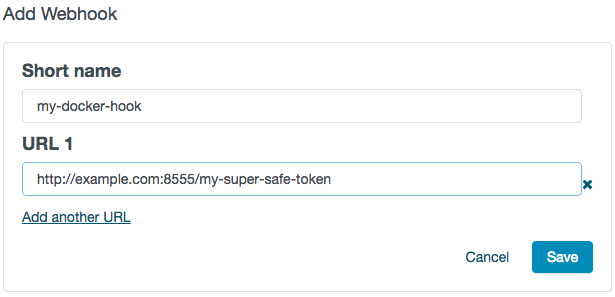 Add a webhook like on the following image. example.com can be the domain of your server or its ip address. docker-hook listens to port 8555. Please replace my-super-safe-token with your auth-token.