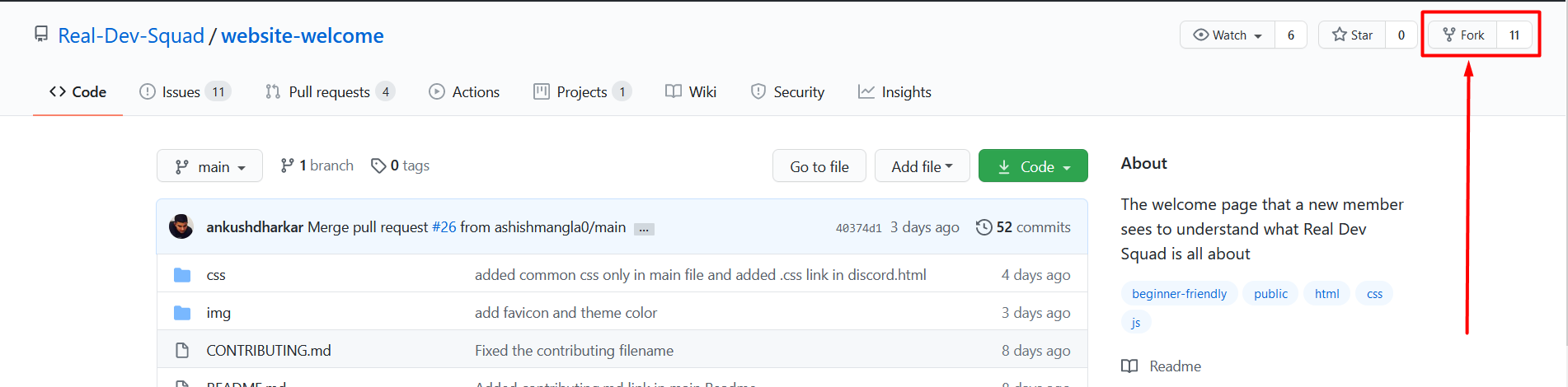 Fork this repository using the Fork option at the top-right corner of this page. This will create your own copy of this repository. You'll be redirected to your forked repository. Copy the link of this repository (which will look like https://github.com/<your-username>/website-welcome/) as you'll need it in the step 2.