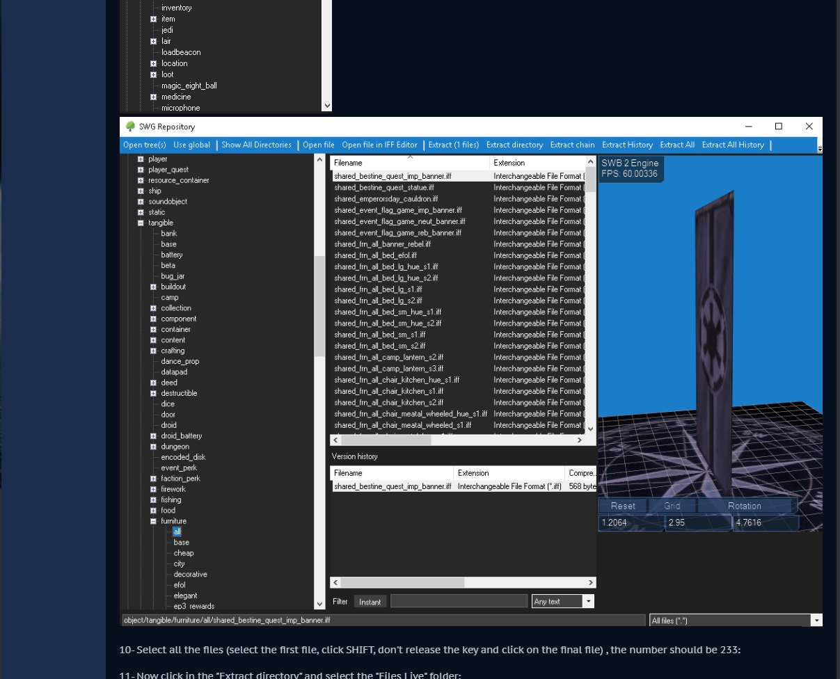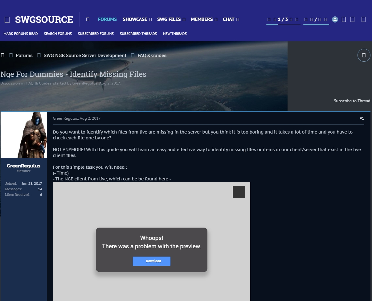 Users Who Are Viewing This Thread (Users: 1, Guests: 0) Users Who Have Read This Thread (Total: 0) Share This Page ABOUT US Community for sharing and guides on how to get a SWG Server up and running. Our goal is to allow people to share information freely and publicly and to preserve that information.