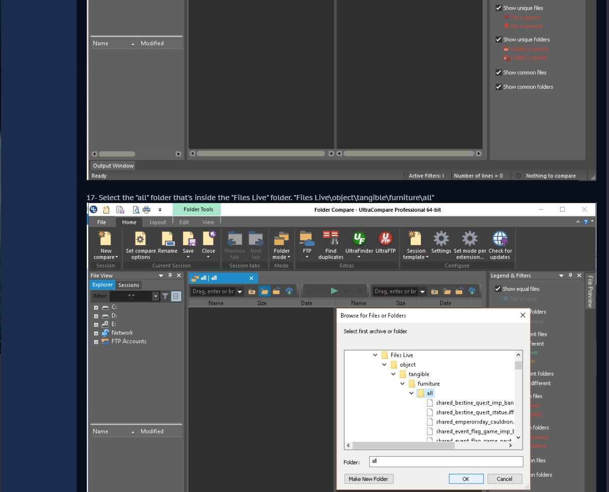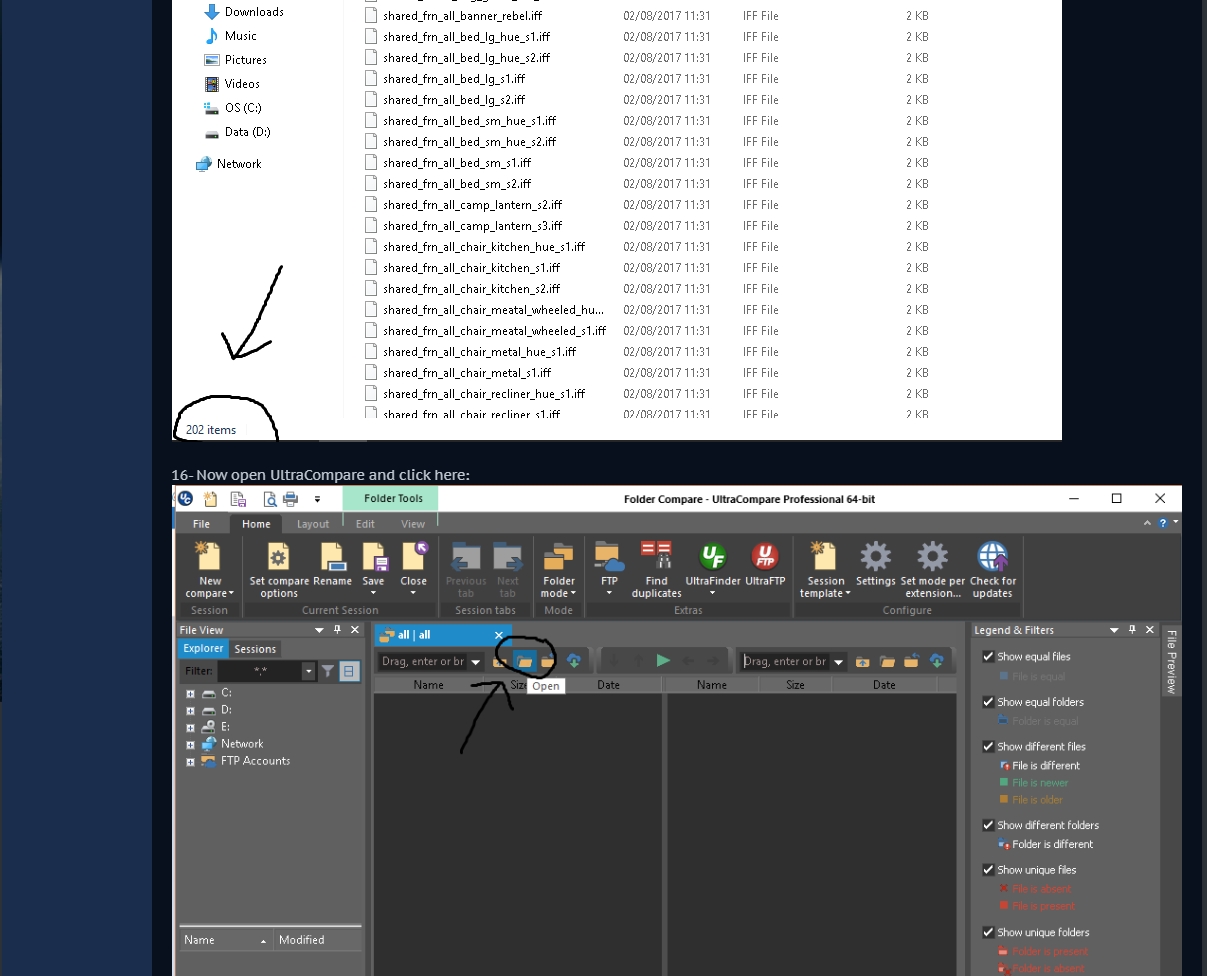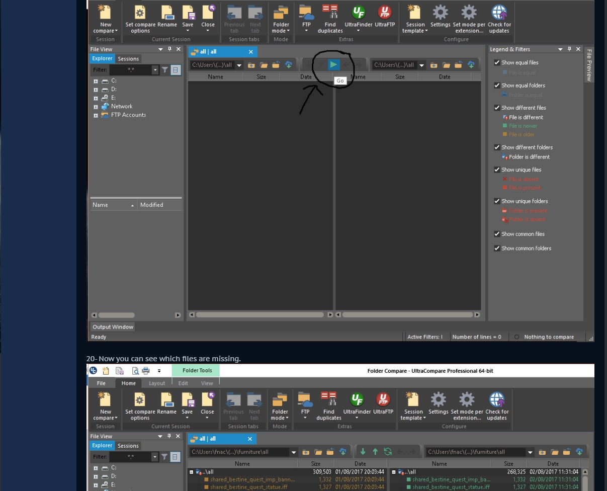 - A program that can compare files from different folders and tell you which ones are duplicates and which ones are missing. In this guide I will use UltraCompare ( use the trial version ) - https://www.ultraedit.com/downloads/ultracompare-download/