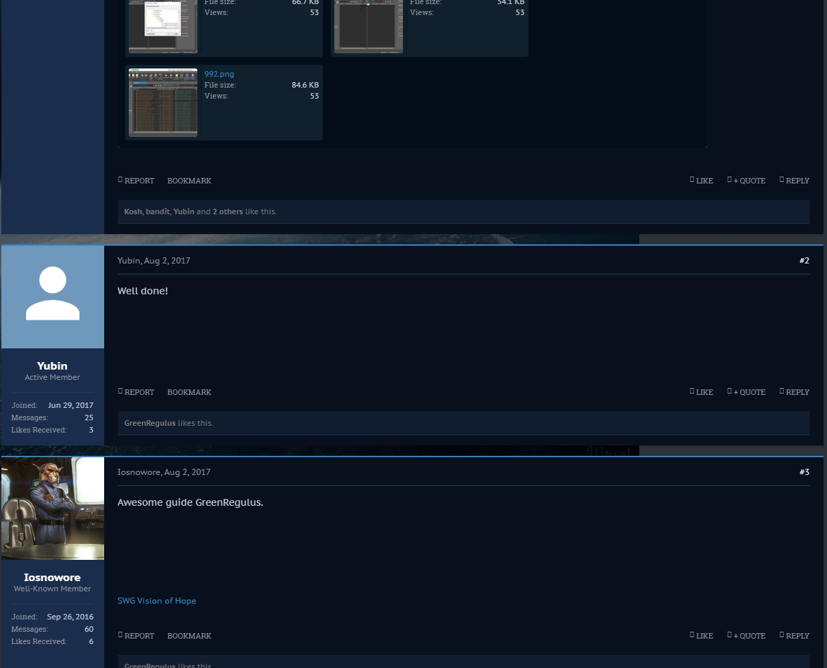Happy testing! Attached Files: 1.png 1.png File size:8.9 KB Views:53 2.png 2.png File size:27.7 KB Views:53 3.png 3.png File size:29.3 KB Views:53 4.png 4.png File size:30.1 KB Views:53 5.png 5.png File size:211.3 KB Views:53 6.png 6.png File size:31.3 KB Views:53 7.png 7.png File size:10.1 KB Views:53 8.png 8.png File size:11.3 KB Views:53 9.png 9.png File size:10.8 KB Views:53 91.png 91.png File size:169.1 KB Views:53 93.png 93.png File size:136.8 KB Views:53 94.png 94.png File size:181.1 KB Views:53 95.png 95.png File size:64.7 KB Views:53 96.png 96.png File size:59.9 KB Views:53 97.png 97.png File size:54.9 KB Views:54 98.png 98.png File size:52.3 KB Views:53 99.png 99.png File size:66.7 KB Views:53 991.png 991.png File size:54.1 KB Views:53 992.png 992.png File size:84.6 KB Views:53 REPORT BOOKMARKLIKE + QUOTE REPLY Kosh, bandit, Yubin and 2 others like this. Yubin Yubin Active Member Joined:Jun 29, 2017 Messages:25 Likes Received:3 #2Yubin, Aug 2, 2017 Well done! REPORT BOOKMARKLIKE + QUOTE REPLY GreenRegulus likes this. Iosnowore Iosnowore Well-Known Member Joined:Sep 26, 2016 Messages:60 Likes Received:6 #3Iosnowore, Aug 2, 2017 Awesome guide GreenRegulus. :) SWG Vision of Hope REPORT BOOKMARKLIKE + QUOTE REPLY GreenRegulus likes this. Write your reply...
