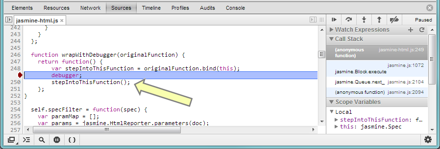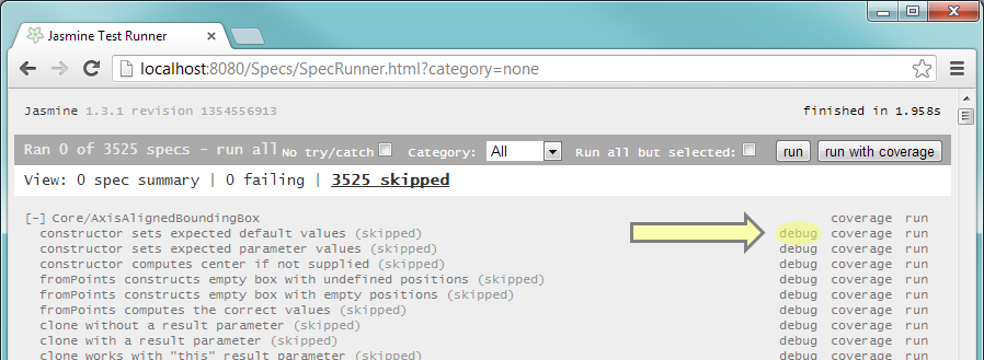 - To debug an individual test (spec), open the browser's debugger, e.g., Ctrl-Shift-I in Chrome, and click debug to the far right of the test.