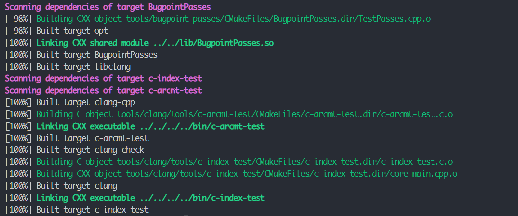 sudo make -j$(nproc) && make install 这里通过指定DCMAKE_INSTALL_PREFIX的方式指定其安装位置。注意,LLVM编译后体积非常大,如果在虚拟机中编译需要给足够内存和硬盘空间(80G+)。