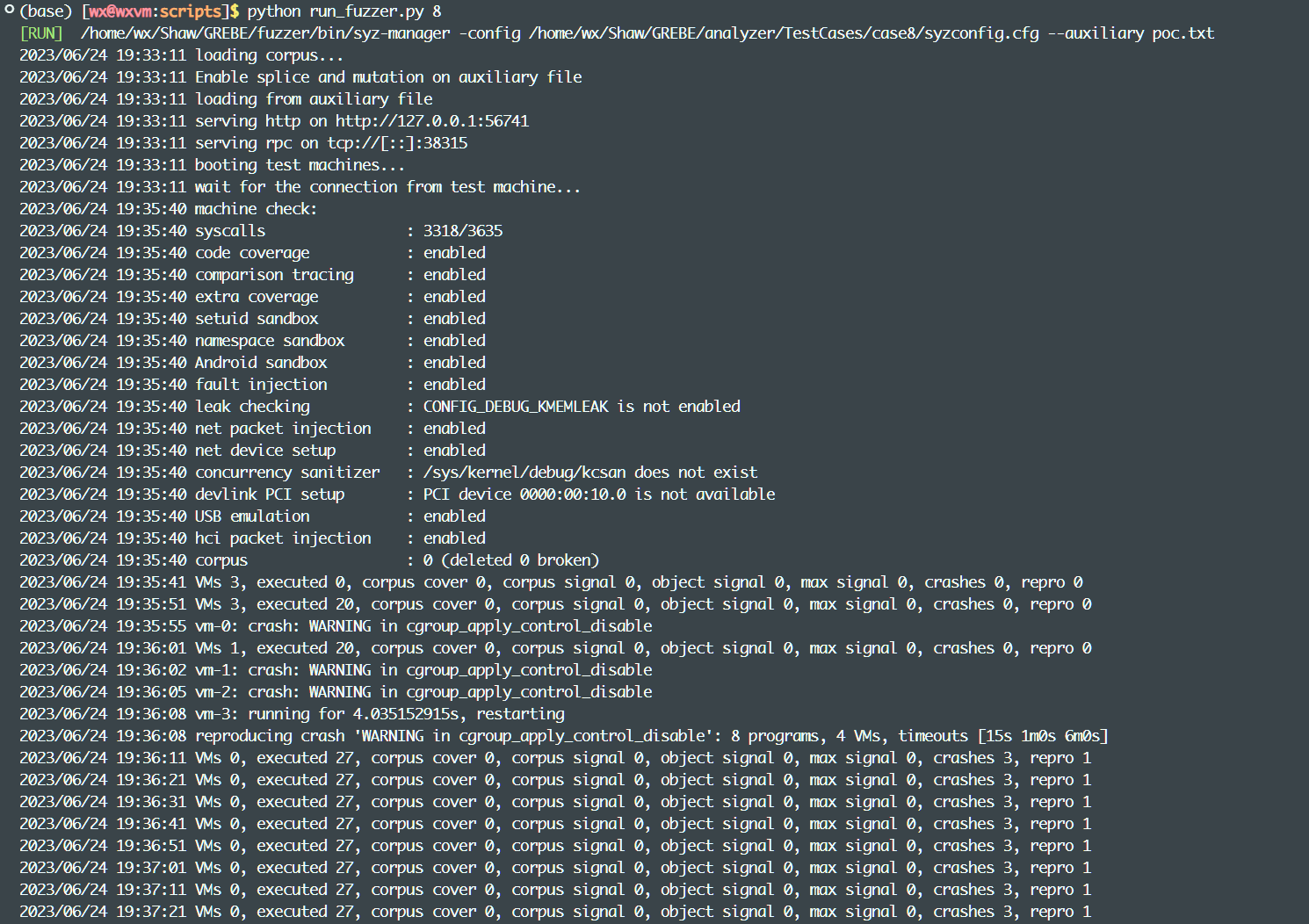 直接使用/fuzzer/scripts/run_fuzzer.py脚本即可运行fuzzer,其会自动定位case文件夹并创建对应的config文件,运行syz-manager: