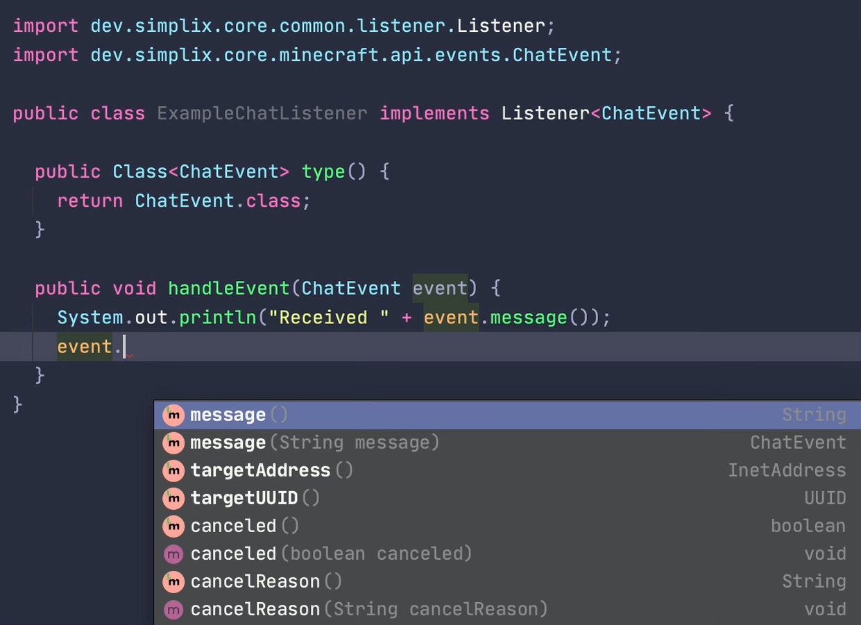 </dependency>The Simplix platform makes use of its own event and listener system. It is needed for our own standalone applications as well as for our plugins. It also contains some abstracted and therefore platform independent events from Spigot/BungeeCord. The SimplixCore handles calling these events on the given platform. You can just start listening for the given events from the simplixcore-minecraft-api module.