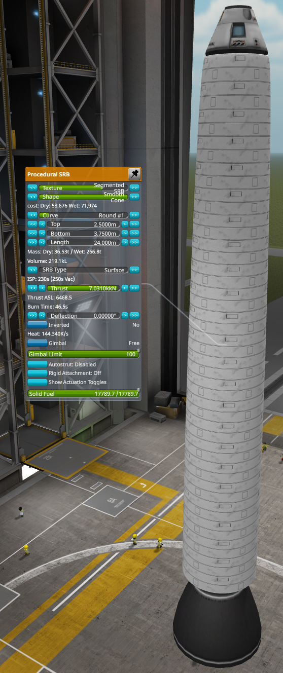 - Make the SRB big, I used a curved cone with a 2.5m top, 3.75m bottom, and 24m length