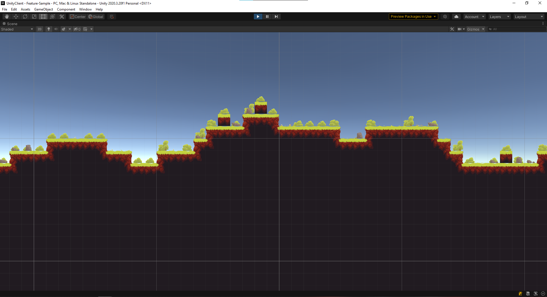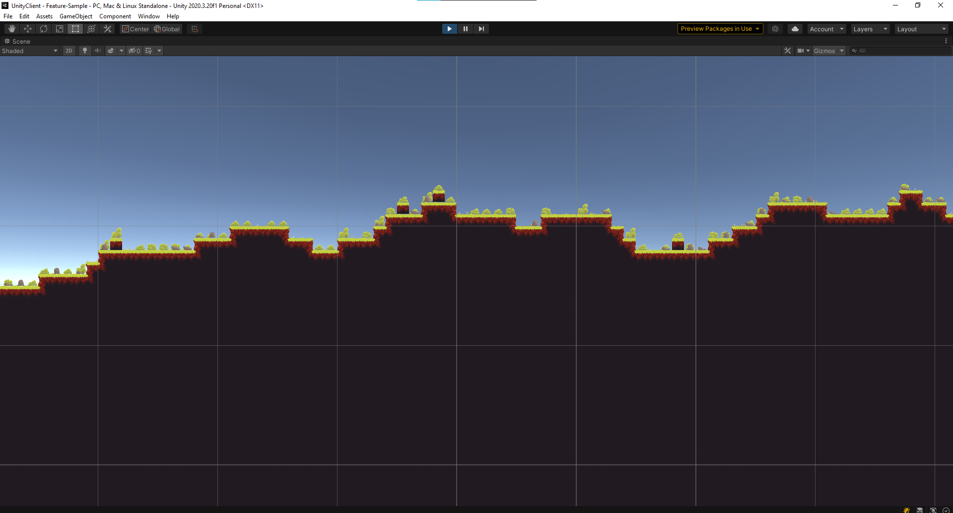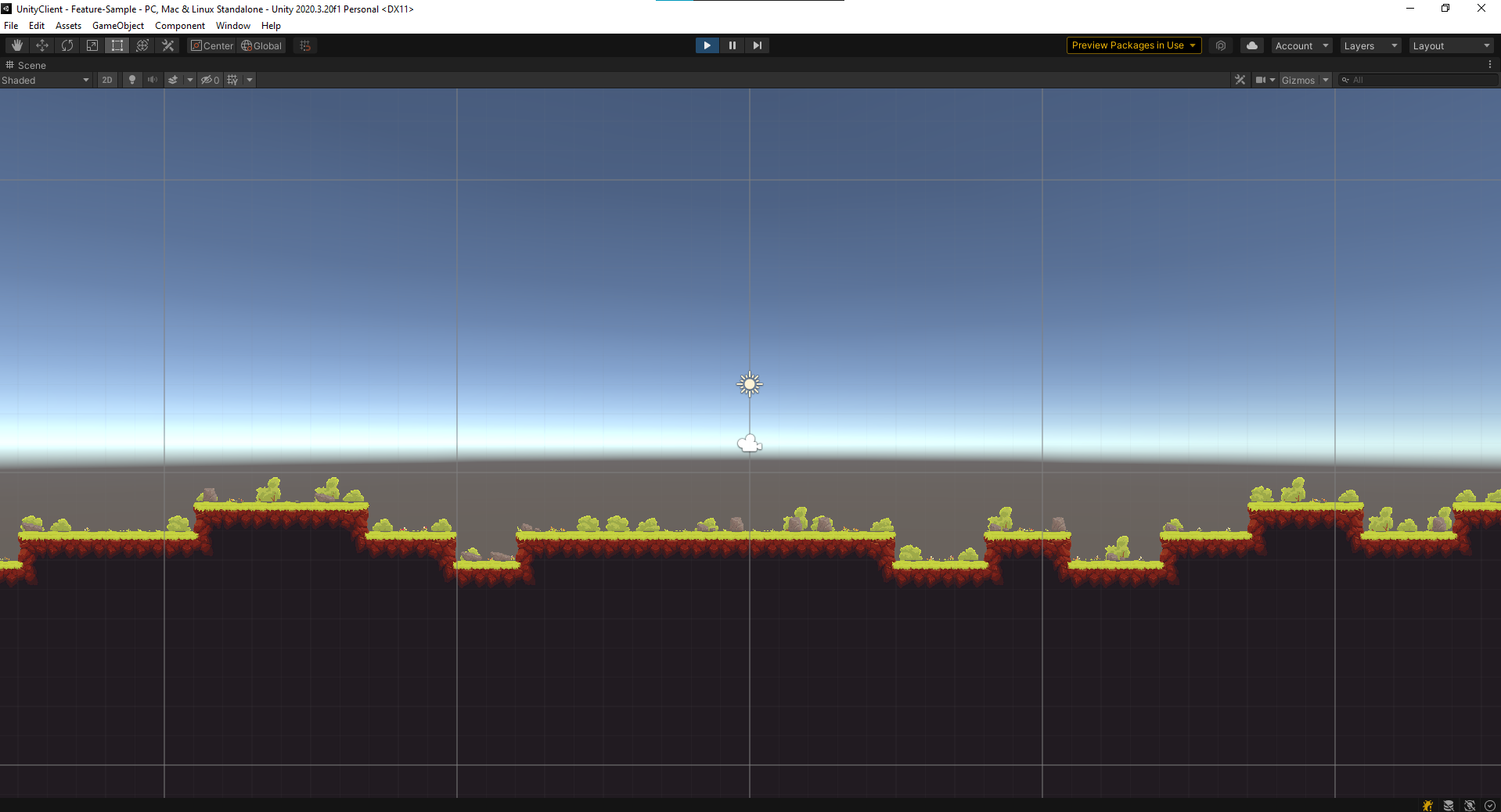 Used tilemaps for the ground, one with collision and with the occasional rock, and another tilemap without collision which contains only grass and bushes for ambiance. The tiles of the ground are arranged using a Rule Tile. The tiles sticking out alone, unfortunately, look jarring, but I did not have a good replacement at the time