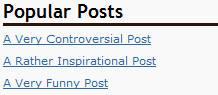 This component displays "popular" posts, either by number of comments (default) or by page views. This option is set on the rendering parameters of the sublayout. Pulling by page view requires either OMS (pre-6.5) or DMS. You can also implement your own custom algorithm by populating the Algorithm property of the sublayout (see code for details). The rendering parameters of this component also allow you to specify an alternate [Dictionary] key that should be used for the component title.