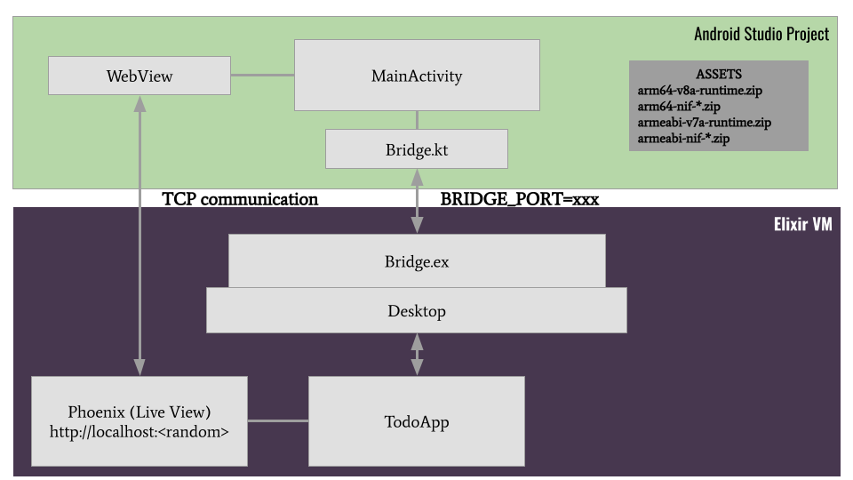The Android App is initializing the Erlang VM and starting it up with a new environment variable BRIDGE_PORT. This environment variable is used by the Bridge project to connect to a local TCP server inside the android app. Through this new TCP communication channel all calls that usually would go to wxWidgets are now redirected. The Android side of things implements handling in Bridge.kt.