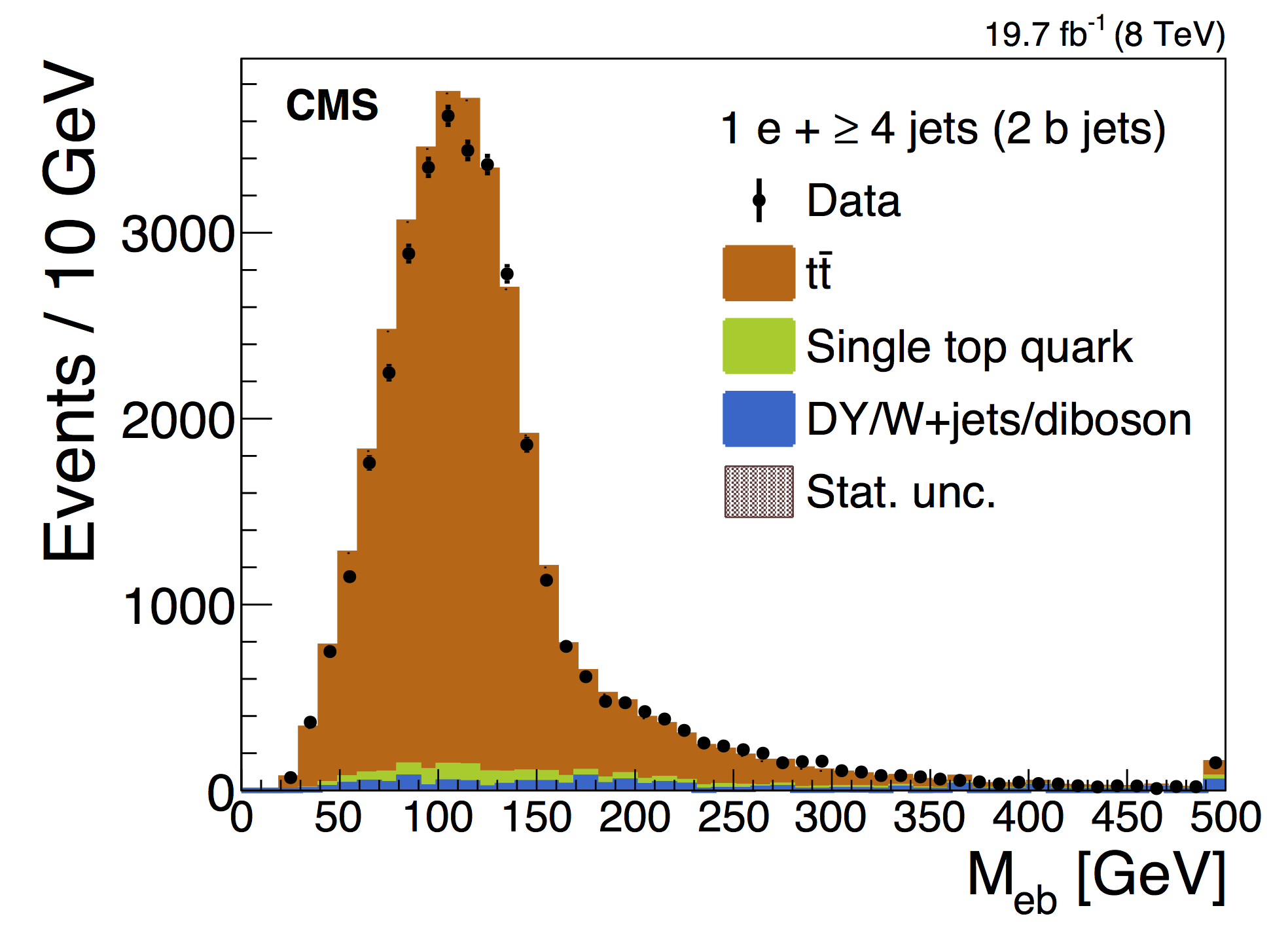 As the figured illustrated in Introduction and the listed observables, the used objects (reconstructed particles) are 2 b-quark jets, the highest non-b quark jet and an isolated electron/muon, which luckily kills many background noise in LHC data. The selected data still contains a few irreducible background noise. However, since the background is expected to have zero