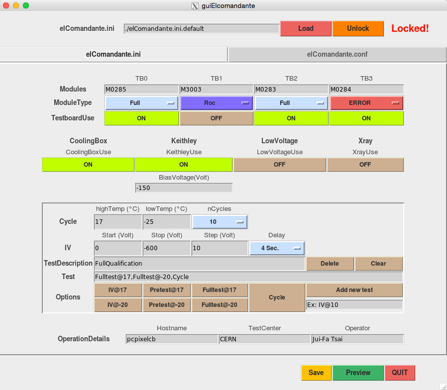 The major hardwares contains cold box, Keithely and digital test board (DBT) which used for cooling the module, supplying high voltage and taking data, respectively. Depending on the test, the setting for the hardware are different. The GUI helps to prepare the parameters in the preprocess of the test. The concept is as the following flow chat: