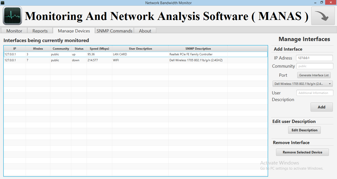 Nework_Bandwidth_Monitor SNMP based network bandwidth , data usage and Speed monitor for SNMP enabled devices Requirements SNMP Enabled devices/interfaces MySql Database PDF reader to view reports How to use Clone the repo and open in netbeans Dependencies SNMP4J iText Screenshots Start screen Graph Report Generation Manage Devices Tab PDF Report