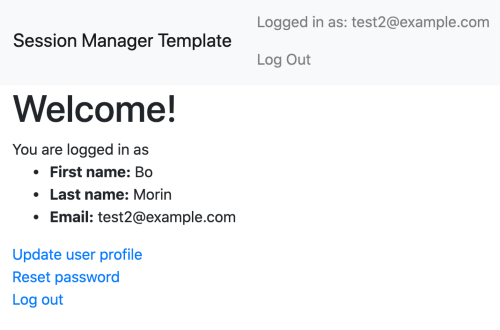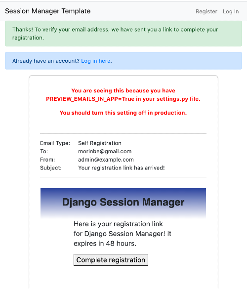 Note No emails are actually sent by default. This app requires you to create a sendgrid account with a valid API key for that to work. The purpose of the email preview is for ease of development and testing. See the SessionManagerEmailer details below for details.