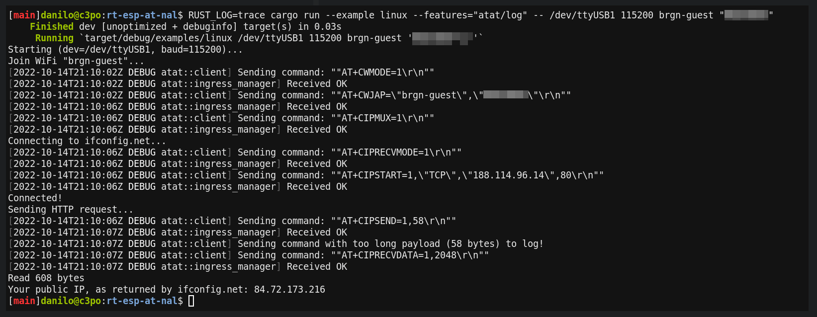 Here's the Linux example ported from espresso to es-at-nal. It took me a while to figure out how to set up atat to work together with esp-at-nal, an example like this one would have helped me a lot.