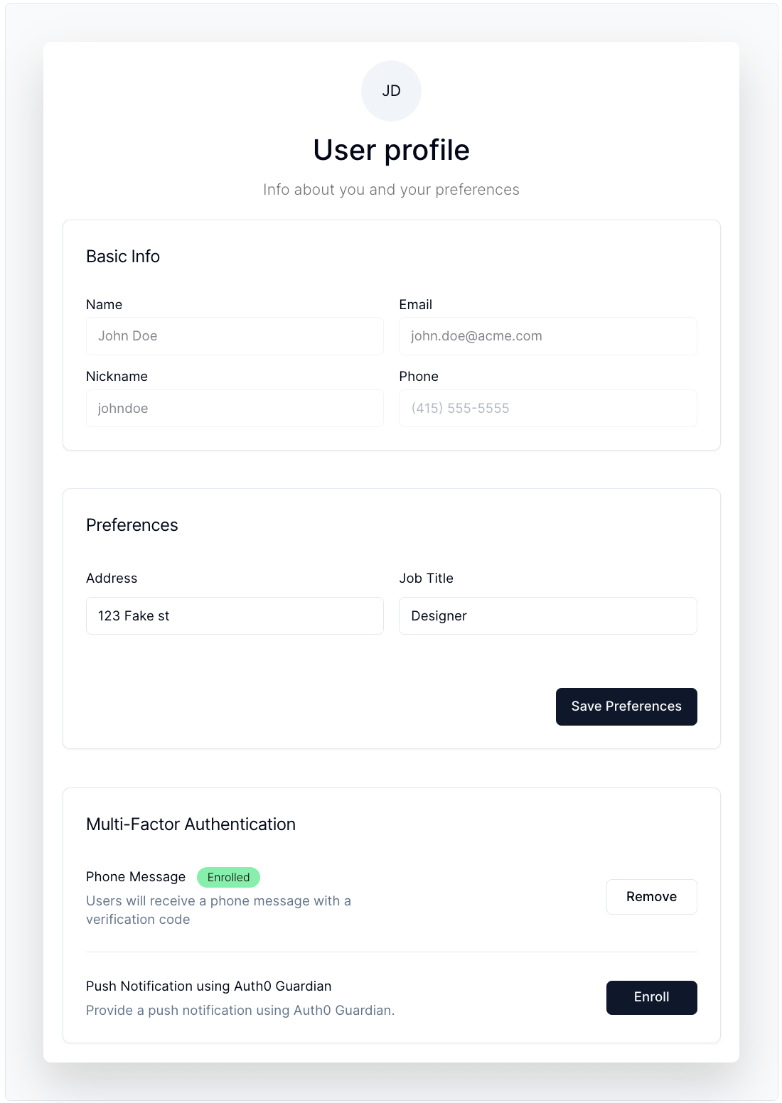 Provides a detailed user profile with essential information, supporting MFA enrollment. For more info, visit the component docs.