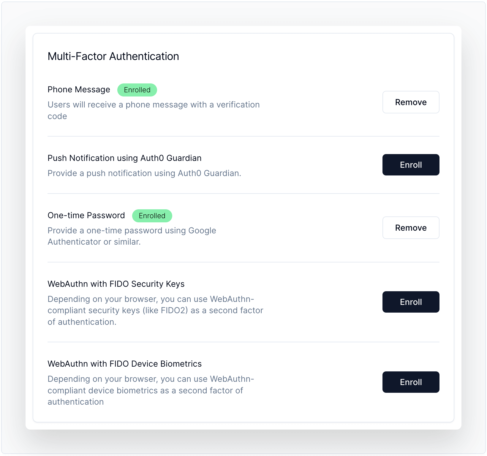 Allows users to view, enroll, and manage multi-factor authentication (MFA) enrollments with ease. For more info, visit the component docs.