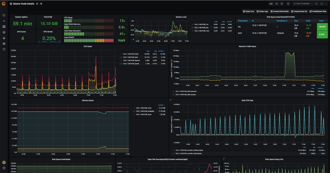 - HeadNode Details - this dashboard shows detailed metric for the HeadNode, including CPU, Memory, Network and Storage usage.