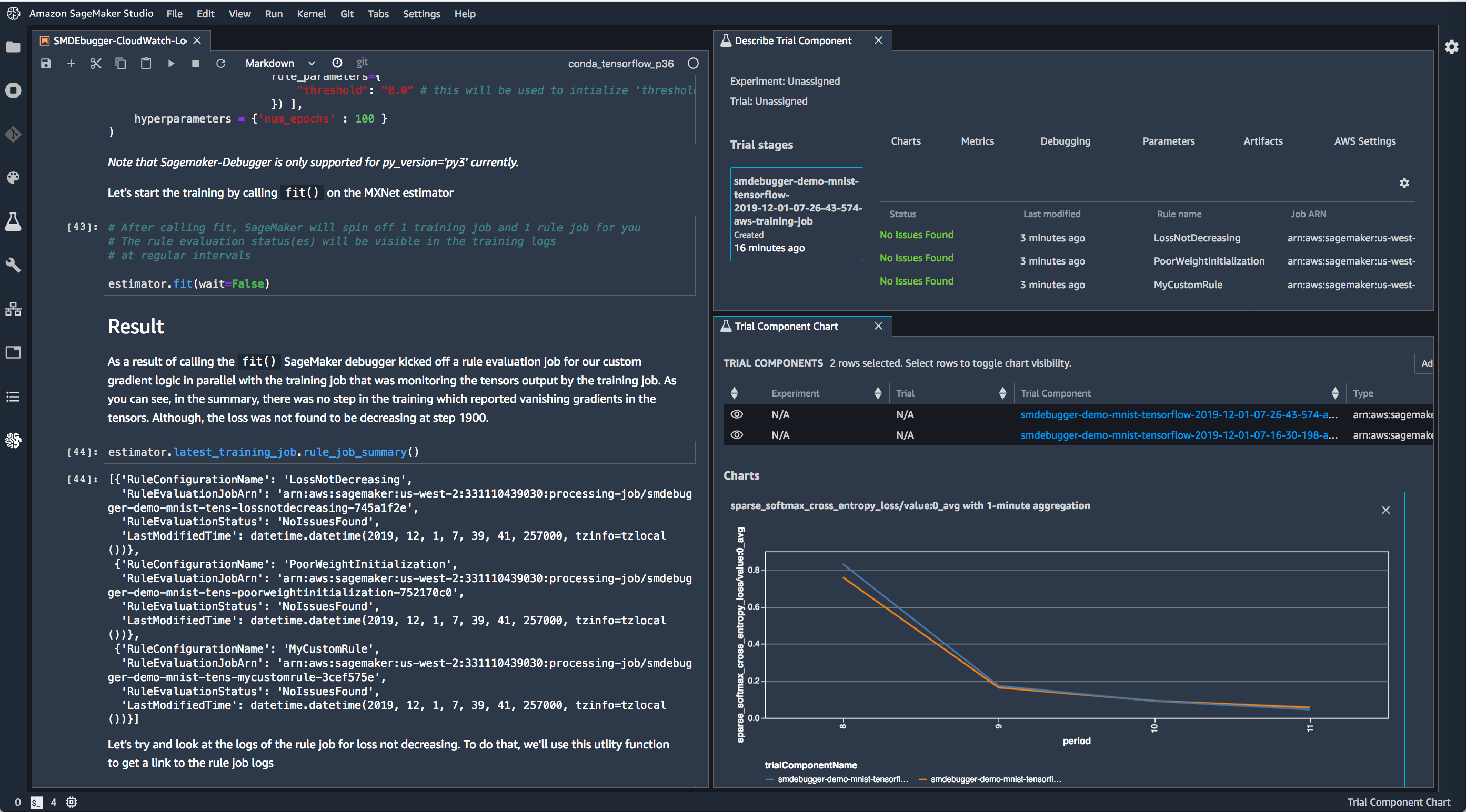 Use Debugger with TensorFlow in SageMaker Studio to run built-in rules and visualize the loss.