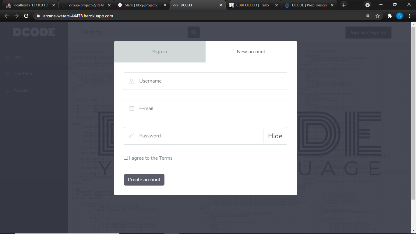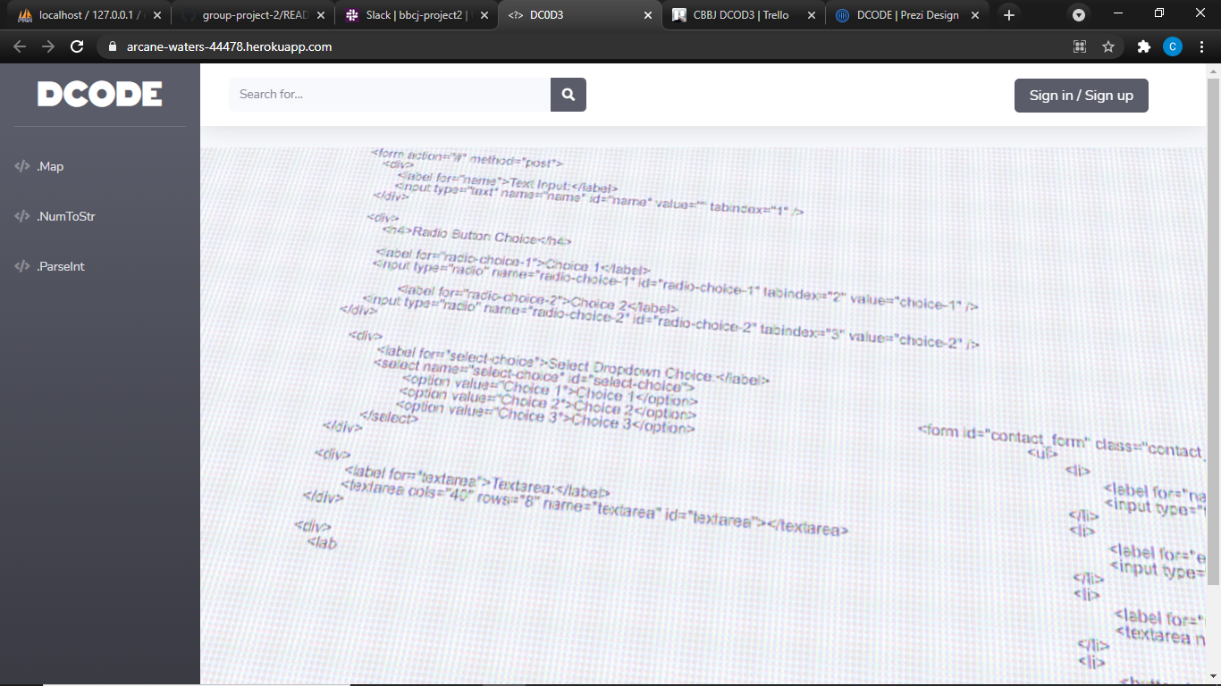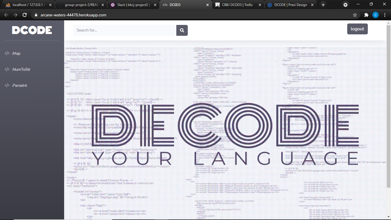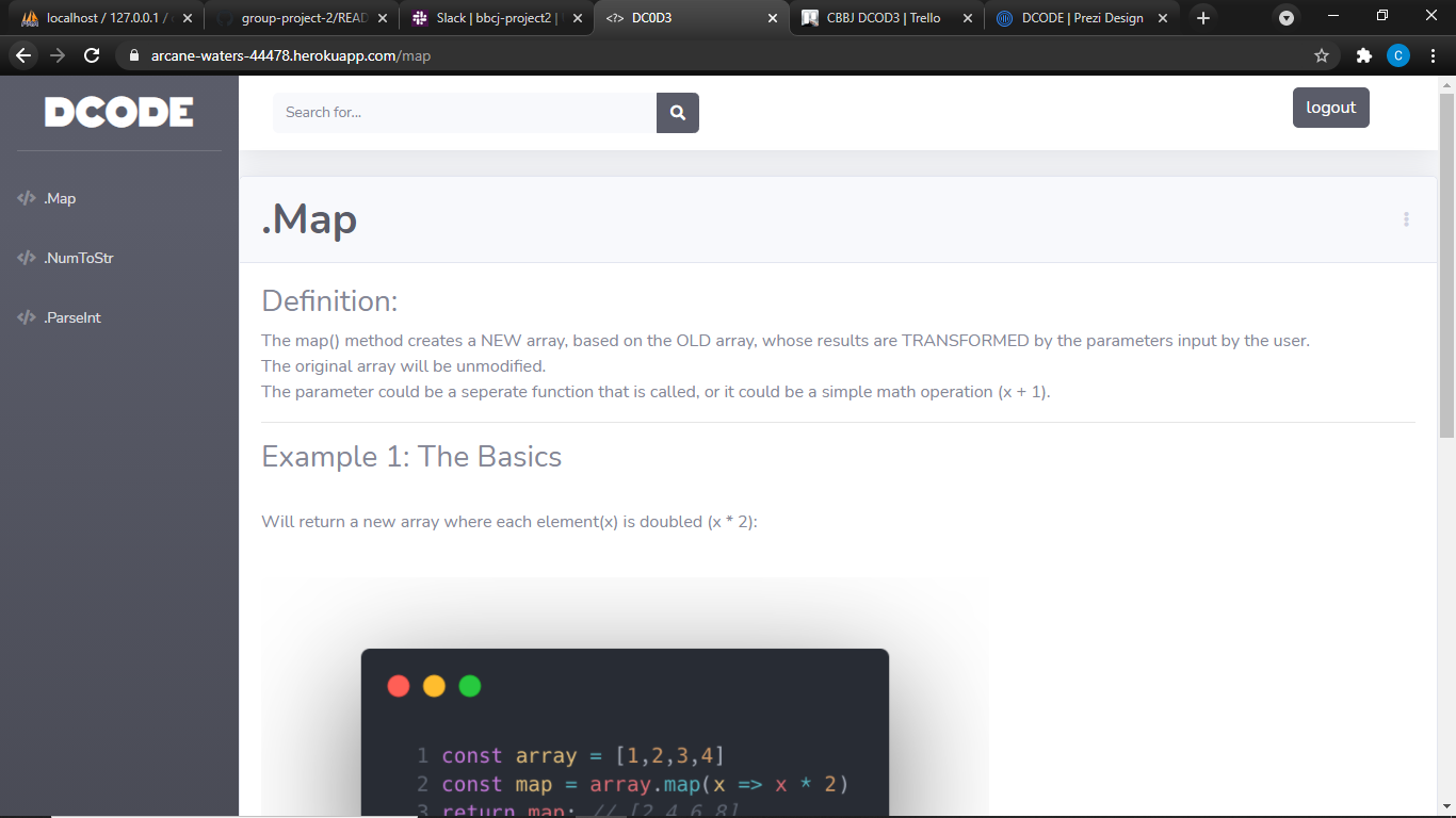 DCODE is a modern tool for developers, specifically full-stack developers. The content within DCODE includes many helpful function documentations. Our goal in this project was to provide an 'encyclopedia' of code that will help beginners and advanced developers alike!