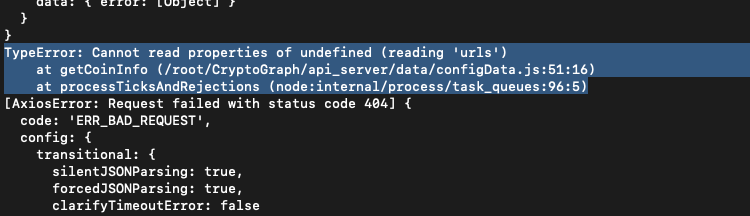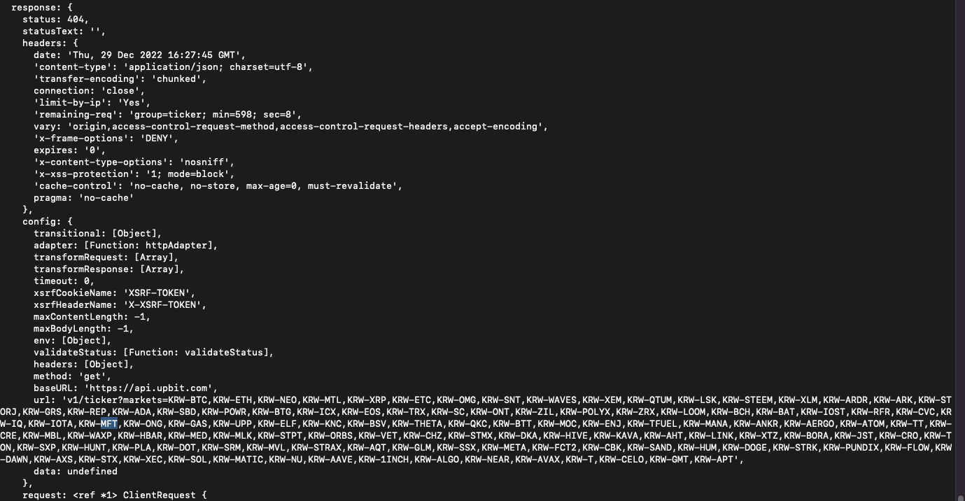 메모리에 저장되는 코인정보는 업비트에서 MFT가 HIFI로 변경된 이후로 계속해서 갱신되지않았고, 기존의 메모리에 저장된 코인정보를 이용하여 데이터를 조합하는 ./api_server/data/getData.js의 getMarketCapInfos()가 호출되면 2번사진과 같이 404에러가 발생하였습니다.
