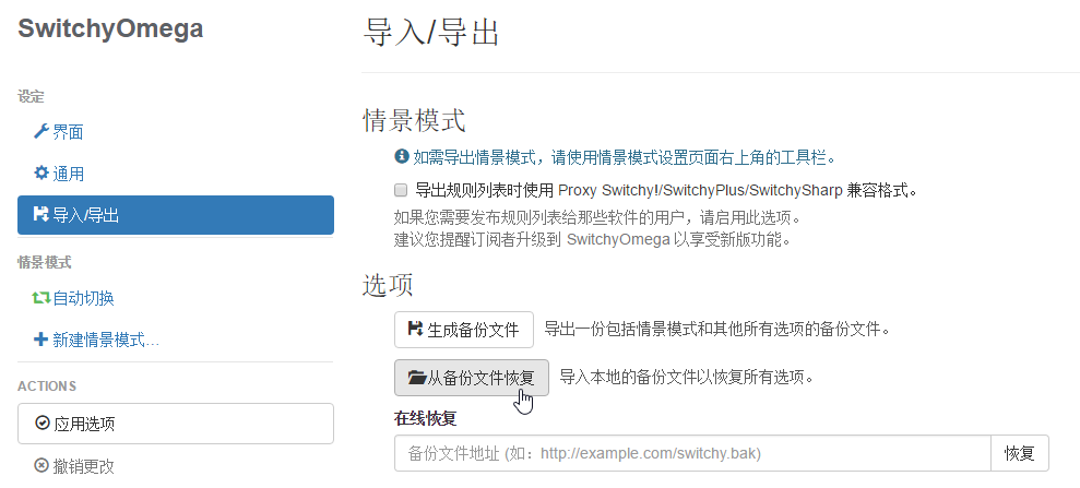 然後打開 Proxy SwitchyOmega 的設置,選擇從備份文件恢復,然後選擇剛才下載的文件,如圖