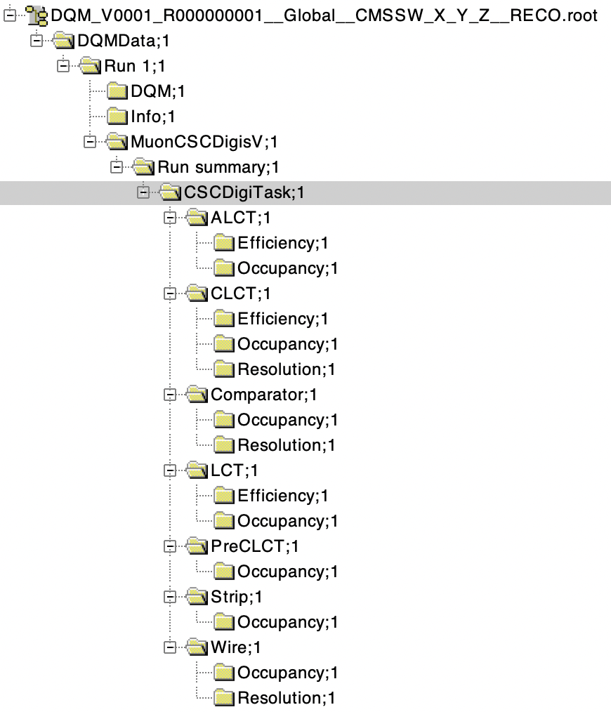 I also added diagnostic plots for ALCT, CLCT, CLCT pre-trigger, and LCT for each chamber type and for each endcap (sometimes we see asymmetries in the performance). I borrowed a lot of code from the L1T CSC DQM tools which I wrote earlier this year. I organized the plots by object, and by type of plot, so it's not all in one directory. The screenshot below shows the directory structure (tested on 100 1TeV muon events). Not every object has each type of plot. E.g. I don't have resolution plots for ALCTs.