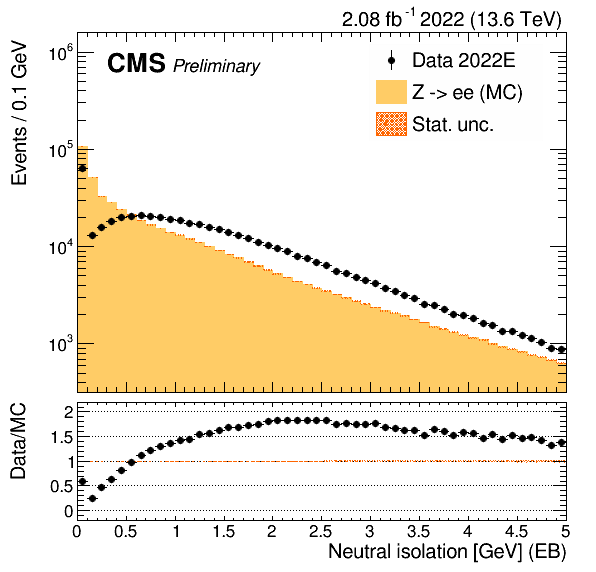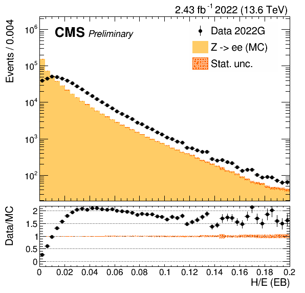 For example, here are the plots of electron's PF neutral hadron isolation and H/E in 2022 EraE and EraG respectively, in prompt reco, which shows that the noise in data is not modelled in MC.