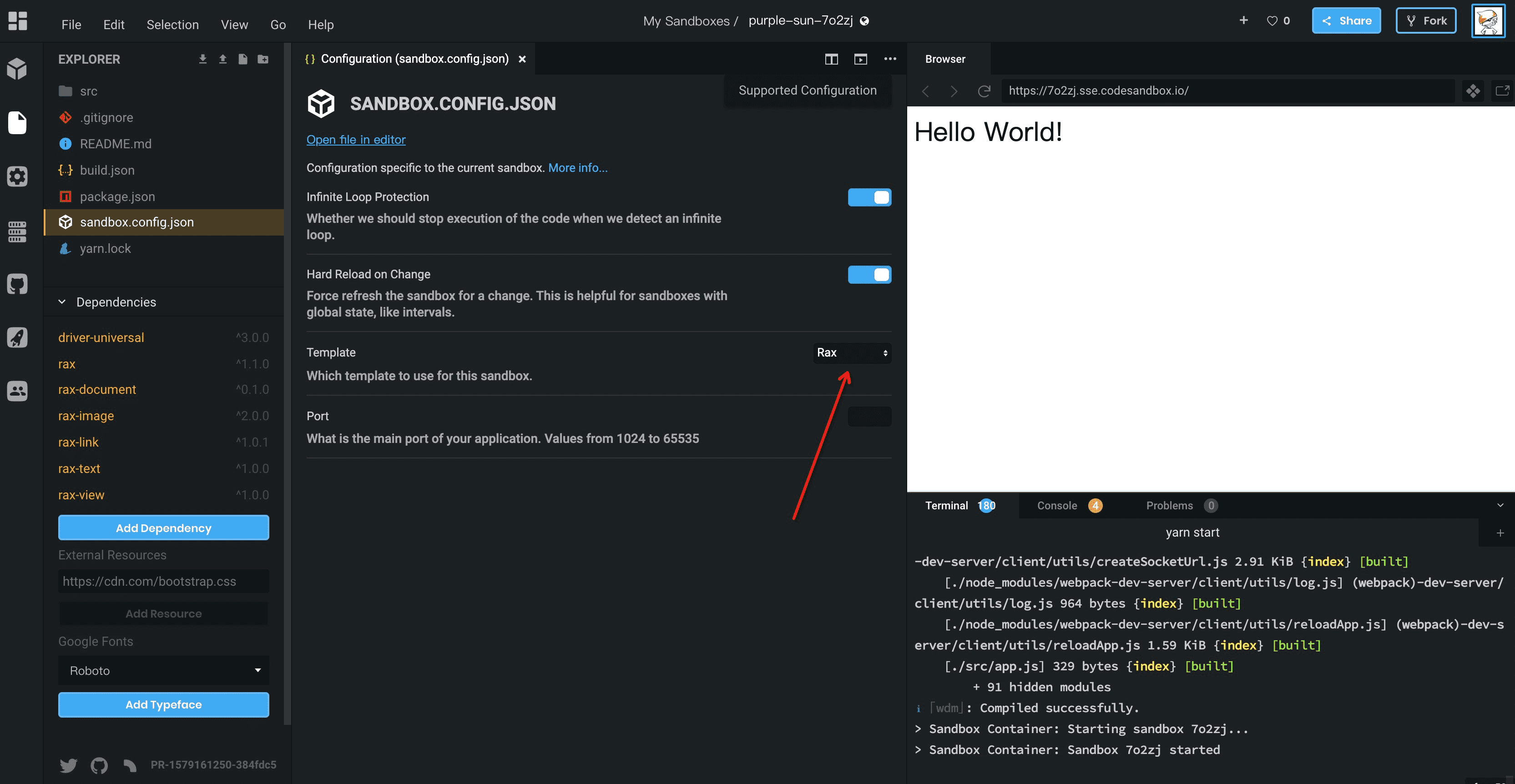We can build a rax project at this address, but the default setting in sandbox.config.json, rax, will fail. The default setting, node, can only be changed to rax manually How can I set the rax template type by default? |